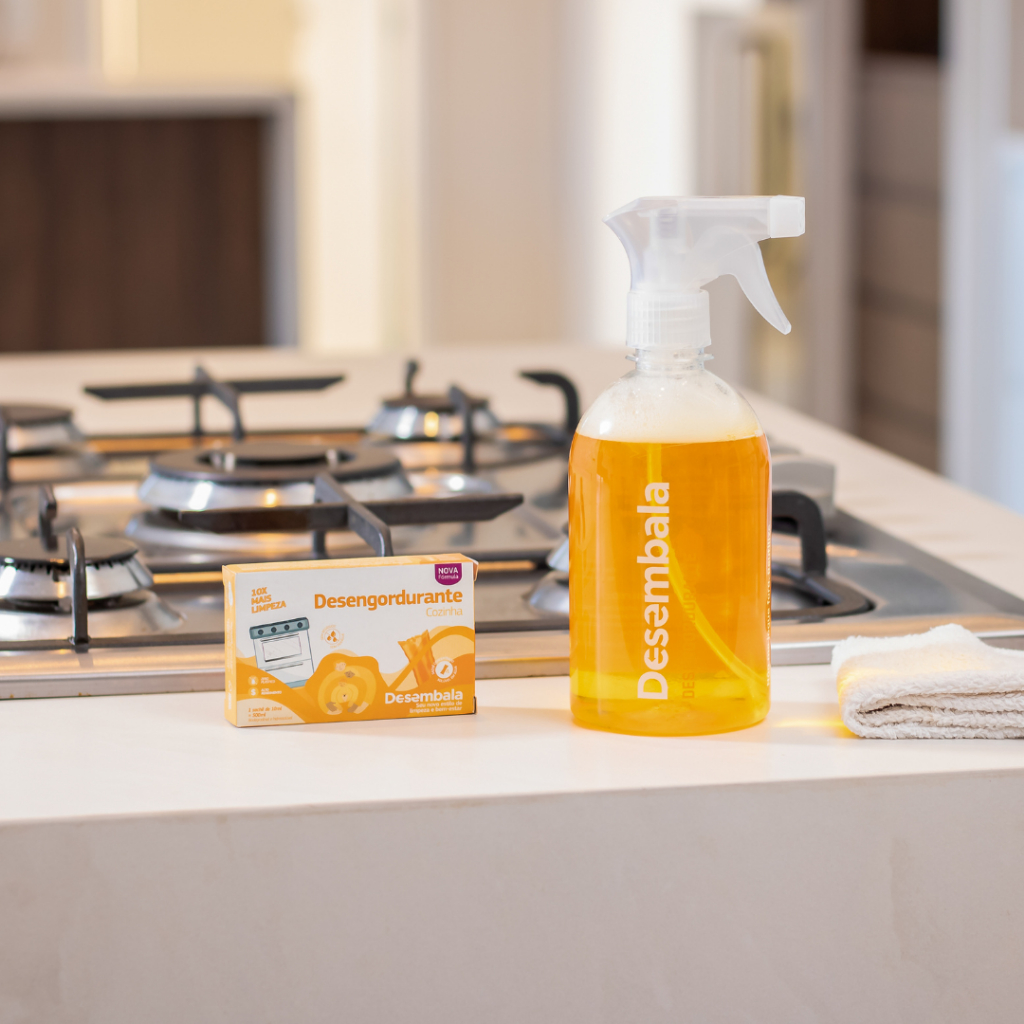 O Desengordurante Desembala é perfeito para limpeza da sua cozinha, eletrodomésticos, utensílios, pias e bancadas. Ele é um dos mais poderosos da nossa linha de produtos, indicado para limpezas mais pesadas. O melhor de tudo é que ele também é sem enxágue, economizando o trabalho de ter que jogar água várias vezes para retirar o produto. Te proporciona uma limpeza prática e deixa sua cozinha brilhando. 1 refil = 500ml de Desengordurante Desembala Você vai se surpreender com a eficiência deste Desengordurante. Quanto mais sujeira, mais tempo você vai deixar ele agir para não ter que esfregar. Deixe que ele faça o trabalho pesado por você. Composição: Surfactante ou tensoativo: Conversando em português claro, é o ativo de limpeza que consegue, junto com a água (que você vai colocar no seu frasco), “envolver” e prender a sujeira, para que você retire tudo facilmente com um pano seco. Esse processo chama-se emulsificação, ou seja, é o processo de colocar um líquido gorduroso/sujeira no interior de outro de modo a fazer com que partículas de gordura fiquem suspensas, para saírem facilmente. Para essa função, usamos o álcool etoxilado, álcool isopropílico e compostos orgânicos biodegradáveis derivados do álcool e amina. Notificação Anvisa Nº 25351.180816/2019-7.