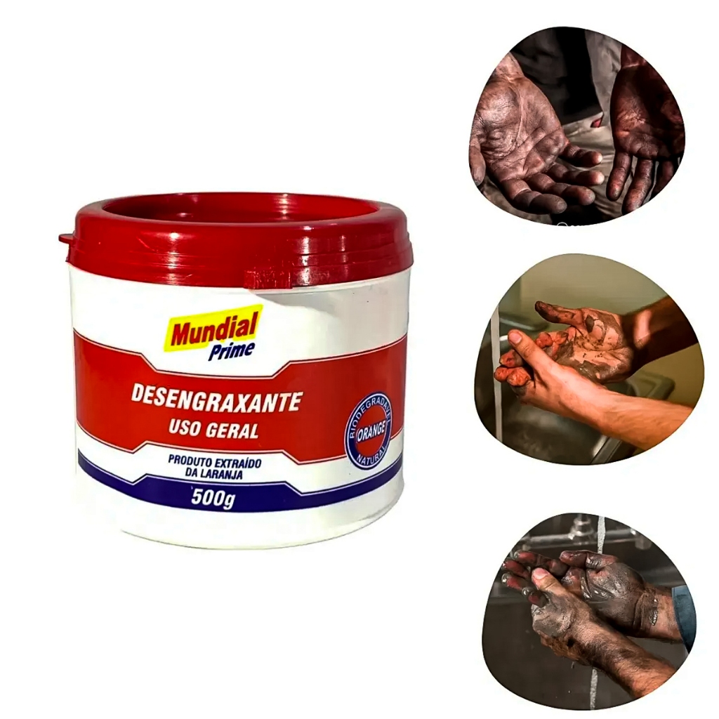 Comercial Vipasa Distribuidora O Desengraxante para uso geral Mundial Prime, é um produto natural biodegradável que não contém nenhum solvente de petróleo. Em sua formula é utilizado um solvente extraído da laranja. Este desengraxante tem um cheiro cítrico fresco e não contem nenhuma fragrância artificial. Sendo ideal para remover graxas, sujeiras, óleos, terra, cimento, colas, tintas entre outros produtos. Desenvolvido para uso profissional e doméstico, é amplamente utilizado em oficinas mecânicas, indústrias, borracharias, funilarias, postos de combustível e serviços de manutenção em geral. Sua fórmula pastosa facilita a aplicação direta nas mãos, promovendo limpeza profunda sem agredir excessivamente a pele, sendo prático e econômico no uso diário. Principais Características: - Aplicações: Remoção de graxas, sujeiras, óleos, terra, cimento, colas, tintas, piche, resinas entre outros - Tipo: Desengraxante para uso geral - Estado Físico: Pastoso - Peso: 500 g Modo de Usar: - Aplique o produto diretamente nas mãos esfregando-as ( não use água ) - Após a sujeira ou graxa estar dissolvida, lave as mãos com água - Se preferir, limpe apenas com um pano limpo e seco. Quem viu este produto também comprou Comercial Vipasa Distribuidora