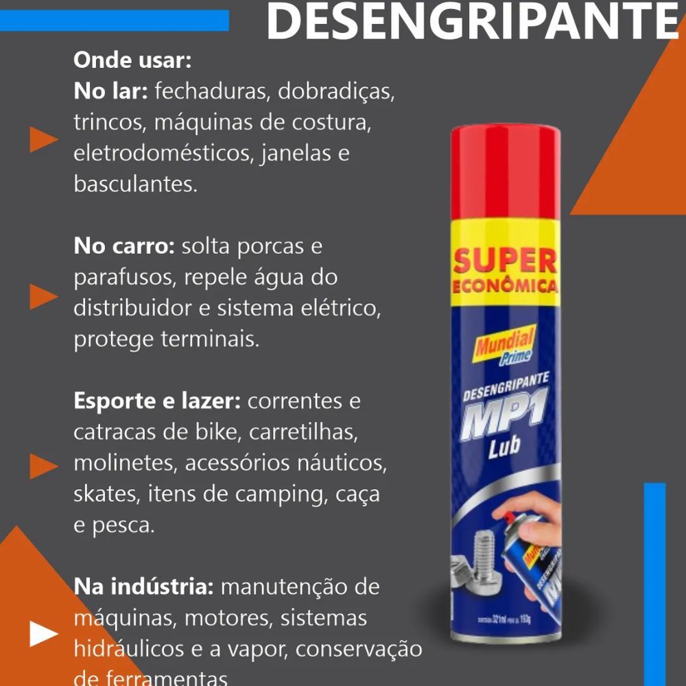 DESENGRIPANTE ANTICORROSIVO MP1 320 ML MUNDIAL PRIME Produto indicado para proteção contra ferrugem, lubrificando e desoxidando peças expostas à umidade do ar e à corrosão. Desengripa de imediato e garante proteção total. Aplicações.: No lar: fechaduras, dobradiças, máquinas de costura, trincos, eletrodomésticos, janelas e basculantes. No carro: solta de forma rápida porcas e parafusos, repele água do distribuidor e do sistema elétrico e protege os terminais. No esporte e lazer: remove a sujeira de catracas e correntes de sua bicicleta. Lubrifica carretilhas, molinetes, acessórios náuticos, skates e material de camping, caça e pesca. Na indústria: usado na manutenção de máquinas, motores, sistemas hidráulicos e a vapor e na conservação de ferramentas. Instruções de uso.: Pulverize o Desengripante MP1 Lub no local desejado ou utilize o prolongador que acompanha a embalagem para aplicação em locais de difícil acesso. Precauções.: Aerossol inflamável. Recipiente pressurizado. Pode romper se aquecido. Seguir atentamente as instruçoes da embalagem para cuidado e aproveitamento eficiente do produto.