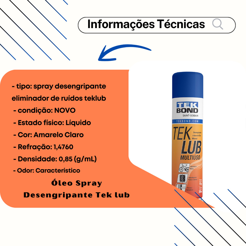 🛠️ Óleo Spray Desengripante TekLub 300ml – Tekbond 🔧 Desengripa, Lubrifica e Protege com Eficiência O Óleo Desengripante TekLub da Tekbond é a solução ideal para quem busca eficiência e confiança na manutenção e lubrificação de peças metálicas. Sua fórmula avançada previne a corrosão, elimina ruídos e protege contra a umidade, prolongando a vida útil dos componentes. ✅ Aplicações Recomendadas Produto versátil e indispensável para o uso doméstico, automotivo ou industrial: 🚗 Automóveis 🚲 Bicicletas e Skates 🚪 Dobradiças de portas e janelas 🔐 Trincos e fechaduras ⚙️ Manutenção de máquinas e motores 🔧 Conservação de ferramentas 📦 Conteúdo da Embalagem 1 unidade de Óleo Spray Desengripante TekLub – 300ml 📋 Especificações Técnicas 🧪 Estado físico: Líquido 🎨 Cor: Amarelo claro 🔬 Refração: 1,4760 ⚖️ Densidade: 0,85 g/mL 👃 Odor: Característico 🌟 Destaques do Produto 🛡️ Protege contra umidade e ferrugem 🛞 Lubrificação de alto desempenho 🛠️ Desengripa e elimina rangidos 🎯 Fácil aplicação com sistema spray 🏆 Qualidade Tekbond reconhecida no mercado 💡 Ideal para Ter Sempre por Perto Produto indispensável para quem busca manter peças móveis e metálicas funcionando perfeitamente, com proteção duradoura e aplicação prática.