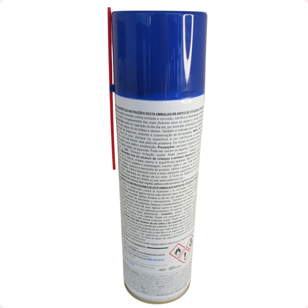 Este anúncio contém: 06 - Desengripante Lubrificante Antiferrugem Multiuso Tekbond. O TEK LUB garante proteção contra umidade e corrosão, lubrifica e desengripa, eliminando ruídos e evitando o engripamento dos mais diversos tipos de peças e roscas metálicas. Ideal para automóveis, bicicletas e skates; dobradiças de portas e janelas; trincos e fechaduras; manutenção de máquinas, motores e conservação de ferramentas. Modo de uso: 1 - Agite bem a lata em movimentos circulares antes e durante o uso; 2 - Aplique na superfície a ser lubrificada ou desengripada direcionando o jato até formar uma película protetora; 3 - Em locais de difícil acesso, utilize o bico prolongador para melhor penetração. Observações e condições da Loja: Antes de efetuar a compra, tire todas suas dúvidas no campo perguntas; Para peças mecânicas, confirme a aplicação com seu mecânico; Todos os nossos produtos são novos com garantia e nota fiscal; Todos os produtos anunciados estão disponíveis em nosso estoque; Para devolução de produtos, somente com embalagem original e Nota Fiscal. Sobre a Empresa: Somos autopeças especializada em linha leve, estamos localizados na zona sul de São Paulo capital. Visando a satisfação e bom atendimento para nossos clientes, trabalhamos com marcas de referência mercado automotivo. Dúvidas frequentes: O Produto é novo? Sim. Trabalhamos apenas com produtos novos e com nota fiscal. Tem garantia? Sim. Todos nossos produtos possui garantia de acordo com a legislação vigente. Como faço para saber se o produto deste anúncio se aplica ao meu veículo? Na descrição do anúncio tem as aplicações do produto, caso ainda tenha dúvidas, entre em contato com a nossa equipe através do campo de pergunta.