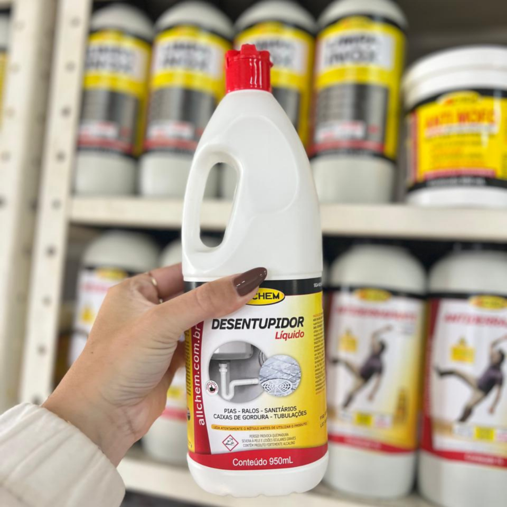 DESENTUPIDOR 950ML ALLCHEM O Desentupidor Líquido Allchem é um produto altamente eficiente projetado para desentupir canos e tubulações com facilidade. Sua fórmula poderosa alcança rapidamente os entupimentos, dissolvendo gordura, cabelo, papel e outros resíduos que obstruem o fluxo de água. O desentupidor líquido é fácil de usar, basta aplicar diretamente no ralo ou na área entupida e aguardar o tempo recomendado. Com o Desentupidor Líquido Allchem, você pode restaurar a funcionalidade das suas tubulações de forma rápida e eficaz. INDICAÇÕES Desenvolvido especialmente para desentupir e promover a limpeza e remoção de sujeiras e gorduras solidificadas em ralos, pias, sanitários, caixas de gorduras e tubulações. BENEFÍCIOS - Limpeza eficaz e segura; - Produto pronto para uso; - Fácil aplicação. MODO DE USO - No ralo e pia: despejar metade do frasco e aguardar a ação do produto sobre a sujeira sem utilizar o local, se necessário repetir a operação. - Vaso sanitário: despejar todo o conteúdo do frasco e imediatamente após acione a descarga, a limpeza deve ocorrer em 5 ou 6 horas. Repetir a operação se necessário, sempre com a ajuda da descarga.