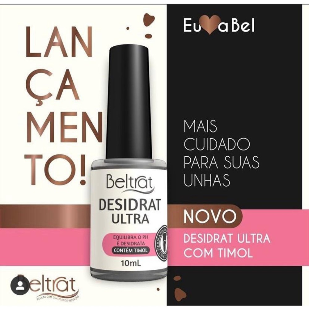 DESIDRAT ULTRA BELTRAT tem a função de regular o PH das unhas, retirando a umidade e oleosidade, preparando-as para receber os produtos de alongamento. Modo de usar: Após lixar as unhas, passe uma camada fina do Desidrat, espere secar naturalmente e, posteriormente, aplique o Primer.
