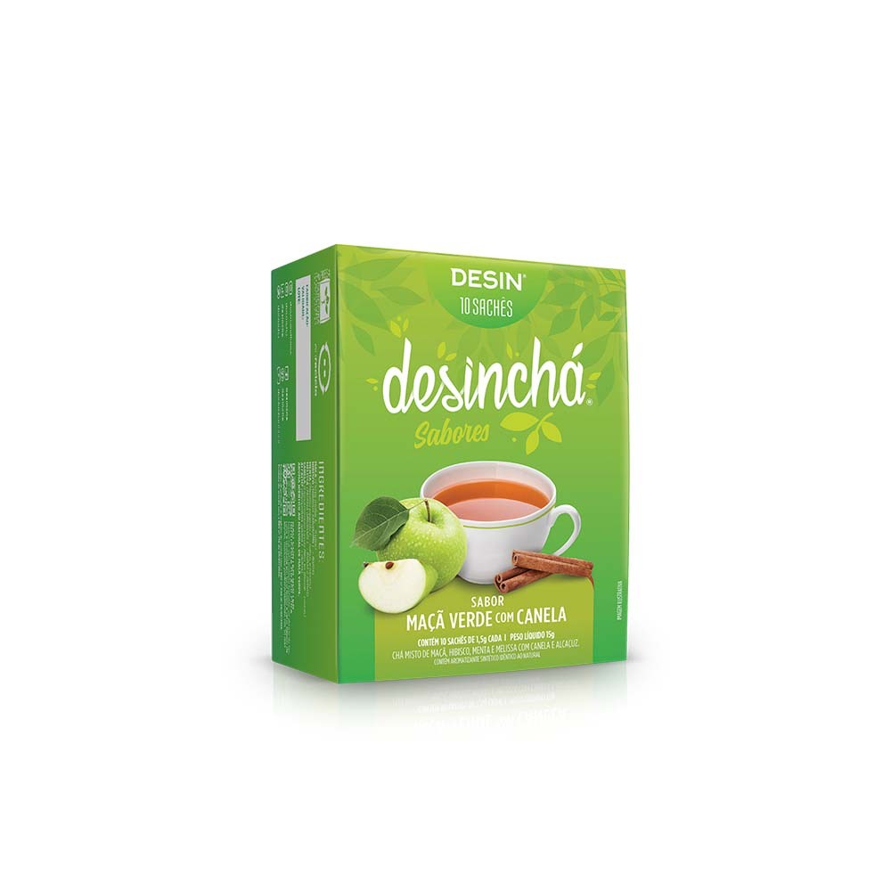 Desinchá Maçã Verde com Canela, é incrivelmente refrescante quando tomado geladinho e irresistível quando você faz quentinho. Pode ser consumido pela manhã, depois do almoço, no lanche da tarde, de tardezinha, à noite, depois do jantar e até antes de dormir, pois a fórmula é sem cafeína. INGREDIENTES Maçã • Hibisco • Menta Melissa • Canela • Alcaçuz • Aroma MODO DE PREPARO: Esquente 200ml de água. Antes de começar a ferver, já pode desligar.Depois basta me colocar dentro da água quente, tampar e esperar por 5 minutinhos. E pronto!Prefere me tomar gelado? É só fazer tudo igualzinho e, no final, adicionar gelo.Fico bom e saboroso por aproximadamente 24 horas, guardando na geladeira.PERGUNTAS FREQUENTES Quando devo consumir o produto? O consumo pode ser realizado em qualquer hora do dia. O produto quebra o jejum? Não, o produto não possui aporte nutricional que interfira no jejum. O produto é vegano? Sim, todos os ingredientes são naturais e não apresentam nenhuma contaminação de origem animal. Quais são as contraindicações de consumo? Recomendamos que gestantes, lactantes e pessoas em condições específicas de saúde conversem com um médico/nutricionista para garantir que o consumo seja seguro, considerando sua individualidade biológica. O produto contém cafeína? Os ingredientes presentes na fórmula não possuem cafeína. Posso adicionar açúcar ou adoçante? Não recomendamos a adição de açúcar ou adoçante! Para uma adaptação do sabor ao paladar, você pode adicionar algumas gotas ou rodelas de limão ou laranja, por exemplo.