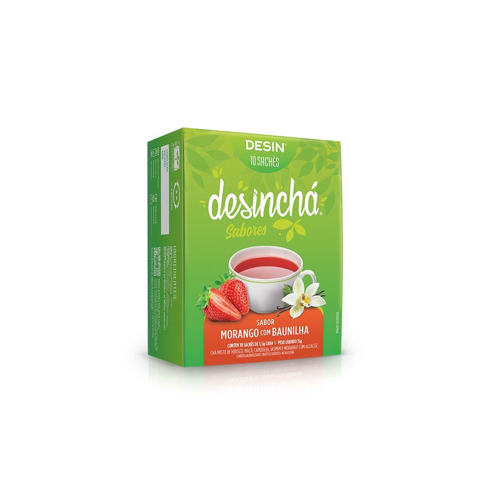 Desinchá Morango com Baunilha, é incrivelmente refrescante quando tomado geladinho e irresistível quando você faz quentinho. Pode ser consumido pela manhã, depois do almoço, no lanche da tarde, de tardezinha, à noite, depois do jantar e até antes de dormir, pois a fórmula é sem cafeína. INGREDIENTES Hibisco • Maçã • Carqueja Jasmim • Morango • Alcaçuz • Aromas MODO DE PREPARO: Esquente 200ml de água. Antes de começar a ferver, já pode desligar.Depois basta me colocar dentro da água quente, tampar e esperar por 5 minutinhos. E pronto!Prefere me tomar gelado? É só fazer tudo igualzinho e, no final, adicionar gelo.Fico bom por aproximadamente 24 horas, guardando na geladeira.PERGUNTAS FREQUENTES Quando devo consumir o produto? O consumo pode ser realizado em qualquer hora do dia. O produto quebra o jejum? Não, o produto não possui aporte nutricional que interfira no jejum. O produto é vegano? Sim, todos os ingredientes são naturais e não apresentam nenhuma contaminação de origem animal. Quais são as contraindicações de consumo? Recomendamos que gestantes, lactantes e pessoas em condições específicas de saúde conversem com um médico/nutricionista para garantir que o consumo seja seguro, considerando sua individualidade biológica. O produto contém cafeína? Os ingredientes presentes na fórmula não possuem cafeína. Posso adicionar açúcar ou adoçante? Não recomendamos a adição de açúcar ou adoçante! Para uma adaptação do sabor ao paladar, você pode adicionar algumas gotas ou rodelas de limão ou laranja, por exemplo.Aproveite e conheça mais sabores de Desinchá.