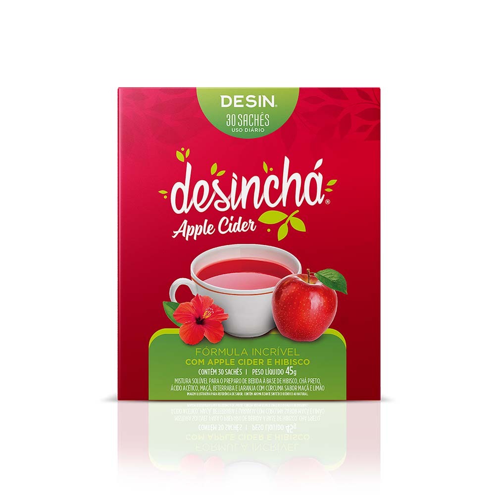 Você vai amar esta novidade: Desinchá Apple Cider, a nova versão de Desinchá para sua rotina de hábitos saudáveis O que é Desinchá Apple Cider? Desinchá Apple Cider, é o mais novo chá da Desinchá a base de hibisco e maçã, vem com 30 sachês na caixinha. Com a missão de mostrar que saúde é simples, a Desinchá alia pesquisa constante e alta tecnologia para ajudar na melhor qualidade de vida de todos. Seus produtos prezam pelo bem-estar sem esquecer da leveza e de sabores irresistíveis. Benefícios Desinchá Apple Cider ✓ Zero Calorias ✓ Sem Conservantes ✓ Sem Corantes ✓ Zero Açúcar INGREDIENTES • Hibisco • Chá Preto • Maçã • Beterraba • Laranja Amarga • Cúrcuma • MODO DE PREPARO Esquente 200 ml de água. Antes de começar a ferver, já pode desligar.Depois basta me colocar dentro da água quente, tampar e esperar por 5 minutinhos. E pronto!Prefere me tomar gelado? É só fazer tudo igualzinho e, no final, adicionar gelo.Fico bom por aproximadamente 24 horas, guardando na geladeira. Perguntas Frequentes Quando devo consumir o produto? O consumo pode ser realizado em qualquer hora do dia, mas recomendamos o consumo do produto quente pela manhã e/ou à tarde.O produto quebra jejum? Não, o produto não possui aporte nutricional que interfira no jejum.O produto é vegano? Sim, todos os ingredientes são naturais e não apresentam nenhuma contaminação de origem animal.Quais são as contraindicações de consumo? Recomendamos que gestantes, lactantes e pessoas em condições específicas de saúde conversem com um nutricionista para garantir que o consumo seja seguro considerando a sua individualidade biológica. Quais são as recomendações de consumo? Você pode tomar 1 a 2 sachês todos os dias.Posso adicionar açúcar ou adoçante? Não recomendamos a adição de açúcar ou adoçante! Para uma adaptação do sabor ao paladar, você pode adicionar algumas gotas ou rodelas de limão ou laranja, por exemplo. Tem combo de Desinchá Apple Cider com outros produtos? Sim, e muitas opções. Tem combo de Desinchá Apple Cider + Desinchá Laranja Moro, Desinchá Apple Cider + Apple HD. E outras combinações que você pode econtrar e comprar aqui.OBSERVAÇÃO SOBRE O DESINCHÁ APPLE CIDER: Sachês úmidos Devido ao teor de umidade e frutose presente na maçã, o ácido acético que é uma substância extremamente higroscópica pode absorver a umidade da maçã e deixar o sachê úmido. A umidade e o teor frutose na maçã é inerente à própria fruta, complemento que a frutose pode variar conforme a sazonalidade e que também apresenta propriedades higroscópicas. Mesmo o chá estando envolto por BOPP e não tendo troca de umidade com o meio ambiente, o calor atua como um catalisador para que ocorra reações no interior do sachê como por exemplo a liberação de água do fruto e consequente absorção pelo ácido acético. Então, pode desfrutar normalmente do seu Desinchá mesmo que o sachê aparente certa umidade.