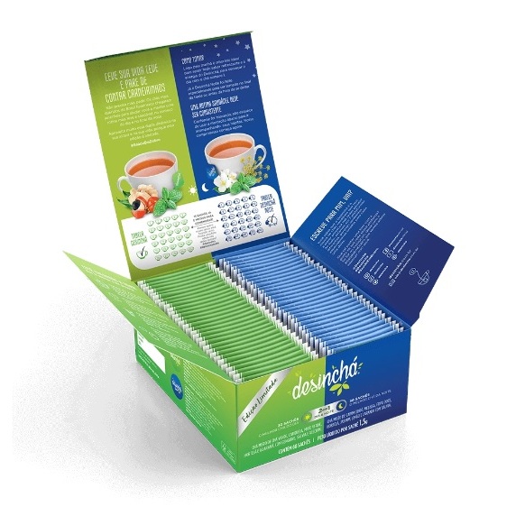 Verde ou azul? A junção tão esperada do Desinchá Dia com o Desinchá Noite é perfeita para você. Saudável e saboroso para os momentos mais importantes do seu dia: pela manhã e antes de dormir. Desinchá Misto tem a disposição das primeiras horas logo após acordar e o conforto e o relaxamento necessários para uma boa noite de sono. Um hábito integral de bem-estar em uma edição especial. O sabor leve e refrescante do Desinchá Dia lado a lado com o frutado e envolvente do Desinchá Noite COMO PREPARAR Para preparar o seu Desinchá, basta fazer a infusão de 1 sachê em 200 ml de água quente e esperar de 3 a 5 minutinhos! Se preferir tomar gelado, basta fazer a infusão em água quente da mesma forma, e adicionar gelo a gosto! Você também pode manter na geladeira por até 24 horas. INGREDIENTES Desinchá Dia: Chá Verde, Carqueja, Mate Verde, Hortelã, Gengibre, Guaraná, Sálvia e Alecrim. Desinchá Noite: Capim Cidró, Melissa, Erva Doce, Hortelã, Jasmin, Sálvia, Limão e Laranja. Desinchá é: SEM GLÚTEN, SEM LACTOSE, SEM CALORIAS, SEM AÇÚCARES, SEM ADOÇANTES e LIVRE DE SUBSTÂNCIAS ALERGÊNICAS. ANVISA: "Produto indicado para maiores de 19 anos". “ Este produto não é um medicamento." “ Não exceder a recomendação diária de consumo indicada na embalagem." “ Mantenha fora do alcance de crianças." “ Este produto não deve ser consumido por gestantes, lactantes e crianças." “ Produto dispensado de registro conforme RDC 240/2018."