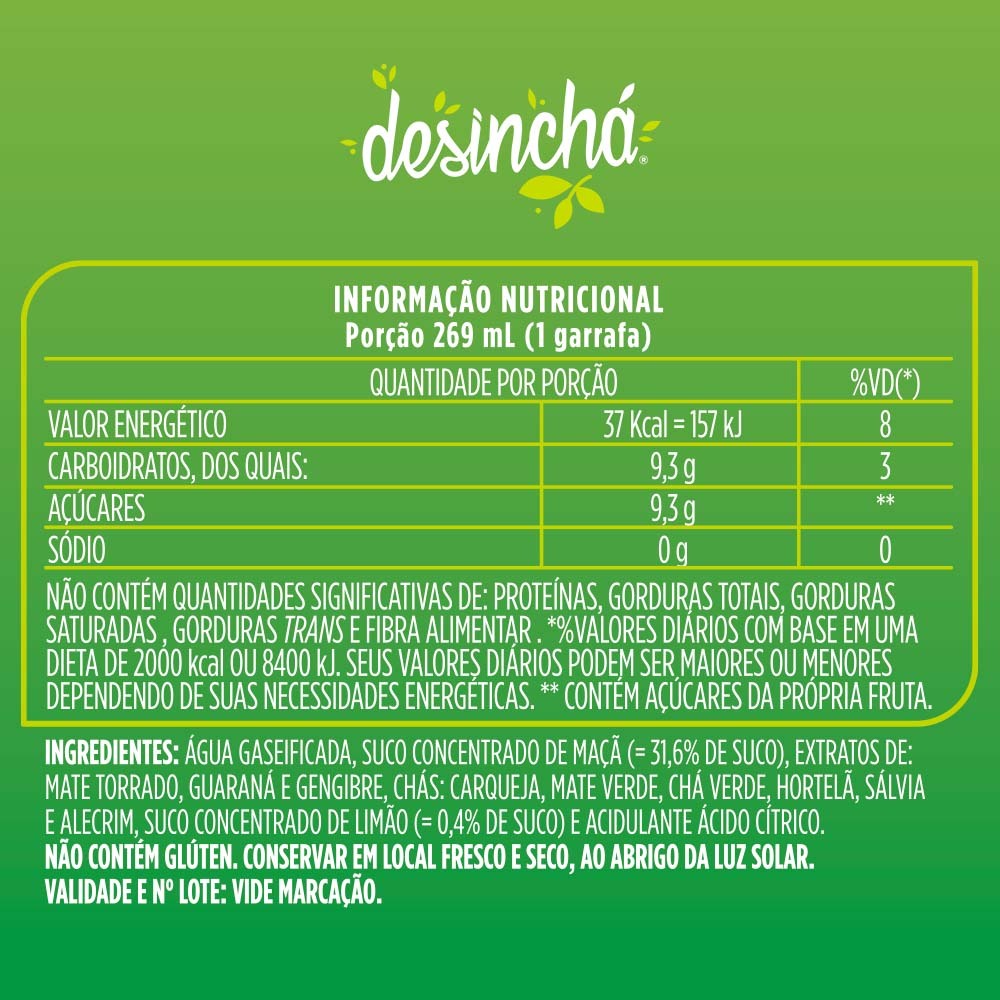 Os amantes de Desinchá pediram e nós atendemos. O seu primeiro hábito saudável do dia ganha uma versão leve e refrescante para ser degustada em qualquer lugar. O grande aliado da rotina saudável virou uma bebida gaseificada, composta pelos 8 ingredientes de Desinchá Dia mais maçã, mate torrado e limão. O Desinchá Supermate é a sua nova bebida favorita da vida. Beba gelado! ✅ Blend exclusivo ✅ 60mg cafeína natural ✅ Baixo em calorias ✅ Sem açúcar ✅ Não alcóolico O seu primeiro hábito saudável do dia com uma nova experiência de sabor e consumo: Conheça seu mais novo companheiro de vida saudável. O Desinchá Supermate te dá um gás a mais e te acompanha não só em casa mas também no restaurante, supermercado, bar e por que não...na balada? Leve sua vida leve em todos os momentos com esse produto completo, delicioso e refrescante. Abriu, tomou, amou. Leve, saudável, refrescante, delicioso, com ingredientes naturais, não-alcoólico, sem adição de açúcares, vegano e se ficássemos aqui falando todas as qualidades dele, só acabaríamos amanhã. ✅ Zero glúten ✅ Zero lactose ✅ Sem açúcares adicionados ✅ Sem substâncias alergênicas ✅ Zero sódio Mas ainda não entendi: fizeram um refri Desinchá, sabor mate? É meu chazinho Desinchá de todo dia cheio de gás? Ou é uma bebida para substituir meu café e me dar energia? Primeiro é bom deixar claro que não precisamos ser isso ou aquilo, apenas estar de acordo com a nossa missão, que é levar mais saúde para o seu dia-a-dia de uma forma leve e prática. Assim, você já sabe que estará consumindo uma bebida com a qualidade Desin. Dito isso, é importante salientar que nosso produto não se encaixa nem na categoria de refrigerantes, pois não possui conservantes, corantes artificiais, quilos de açúcares e etc. Nem na categoria de chás, pois trata-se de uma bebida gaseificada. Você vai ter que experimentar o novo Desinchá Supermate para entender do que estamos falando. A Desinchá não quer apenas te surpreender, quer te mostrar que ter uma vida saudável é fácil, simples e gostoso. É só dar o primeiro gole. ✅ Extratos 100% naturais ✅ Baixo índice glicêmico ✅ Vegano ✅ Leve e refrescante Desinchá Supermate, uma bebida deliciosamente saudável para te acompanhar durante todo o dia. Conte com a gente para um mundo de possibilidades. INGREDIENTES: - Suco concentrado de maçã.- Extratos de: mate torrado, guaraná e gengibre, cafeína natural: 61,47 mg/269 mL. - Chás: verde, carqueja, mate verde, hortelã, sálvia e alecrim. - Suco concentrado de limão e acidulante ácido cítrico. SUGESTÃO DE CONSUMO: - Em qualquer momento do dia, porém, devido a presença de cafeína, recomendamos ingerir de 1 a 3 latas por dia e evitar tomar no período noturno para que não interfira no descanso. PERGUNTAS FREQUENTES 1. Quando devo consumir o produto? Desinchá Supermate pode ser consumido em qualquer momento do dia, porém recomendamos que devido a presença de cafeína, o consumo seja evitado no período noturno para que não possa interferir no descanso. 2. Qual a quantidade de Desinchá Supermate posso tomar? Para que a cafeína, como um estimulante, não interfira na rotina diária, recomendamos a ingestão de 2 a 3 latas (269mL) por dia. 3. O produto quebra jejum? Não, o produto não possui aporte nutricional que interfira no jejum. 4. Quais as contra indicações? É recomendado que gestantes e lactantes conversem com seu médico ou nutricionista antes de consumir o produto. 5. A bebida é vegana? Sim, a Desinchá Supermate não possui ingredientes de origem animal em sua formulação. 6. A bebida é considerada refrigerante? Não. De acordo com o MAPA (Ministério da Agricultura, Pecuária e Abastecimento), o Desinchá Supermate é uma bebida de vegetal, designada legalmente como: BEBIDA MISTA DE MAÇÃ, MATE TORRADO, CHÁ VERDE, CARQUEJA, MATE VERDE, HORTELÃ, GUARANÁ, GENGIBRE, SÁLVIA, ALECRIM E LIMÃO GASEIFICADA. 7. Tem açúcar na formulação? A fórmula é livre de açúcares adicionados, contendo apenas os açúcares da fruta (maçã), utilizada para adoçar naturalmente.