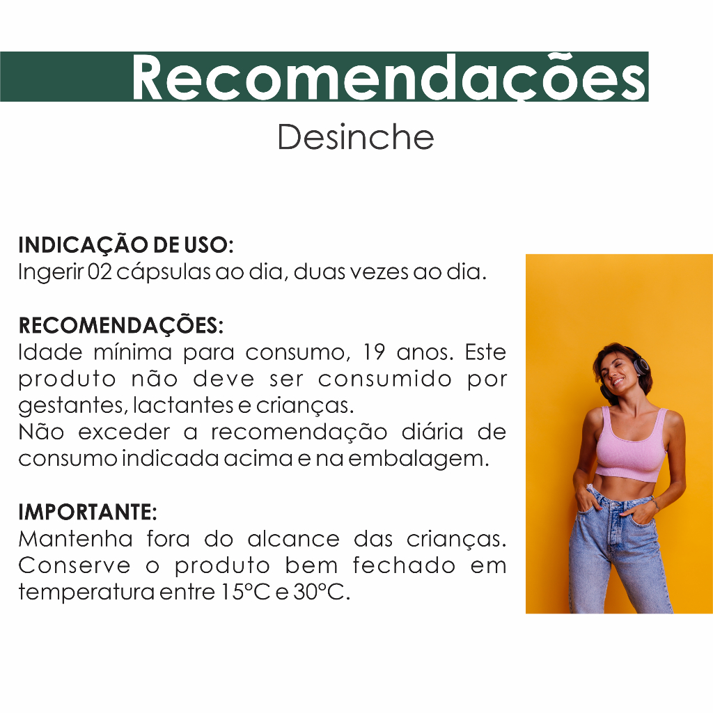 DESCRIÇÃO: Desinche é um produto natural formulado para promover a redução de inchaço e retenção de líquidos no corpo. Com uma combinação cuidadosa de ingredientes botânicos, esse suplemento busca proporcionar alívio e bem-estar, auxiliando no equilíbrio hídrico e na sensação de leveza. BENEFÍCIOS: Auxilia na redução de inchaço e retenção de líquidos. Pode ajudar na digestão e alívio de desconfortos estomacais. Promove a sensação de leveza e bem estar. Auxilia na perda de peso e controle do apetite. Contribui para o equilíbrio e saúde do sistema digestivo. Melhora a energia e disposição. Mantém a aparência mais saudável e revitalizada. INGREDIENTES: Chá Verde, Quitosana, Psylium, Carqueja, Mate Verde, Hortelã, Gengibre, Guaraná, Sálvia e Alecrim em pó. Cápsulas em Gelatina e Umectante Glicerina. INDICAÇÃO DE USO: Ingerir 02 cápsulas ao dia, duas vezes ao dia. RECOMENDAÇÕES: Idade mínima para consumo, 19 anos. Este produto não deve ser consumido por gestantes, lactantes e crianças. Não exceder a recomendação diária de consumo indicada acima e na embalagem. IMPORTANTE: Mantenha fora do alcance das crianças. Conserve o produto bem fechado em temperatura entre 15°C e 30°C. A Sol e Vida, agradece pela preferência e está à disposição para responder suas dúvidas. Nosso compromisso é com sua saúde e satisfação!