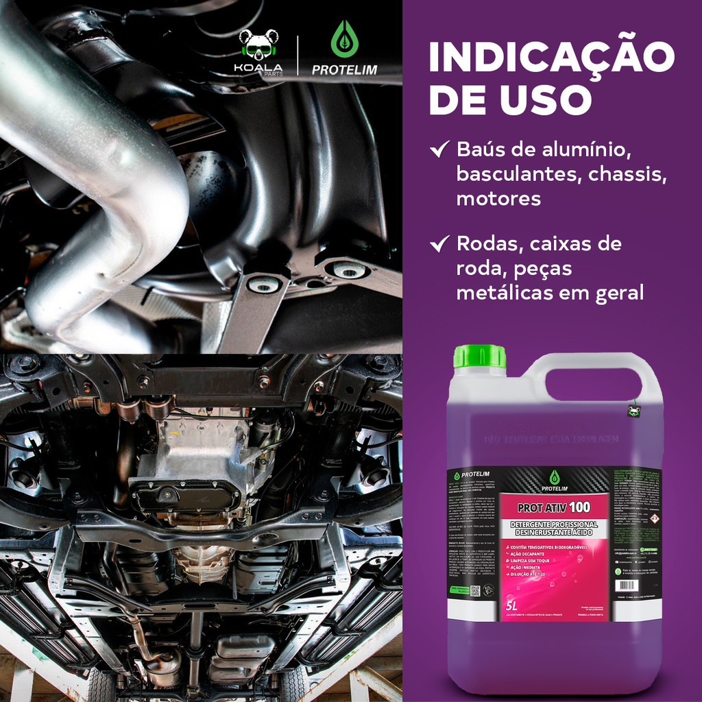 Prot Ativ 100 Desincrustante Ácido 5L Protelim – Limpeza Pesada de Metais Poder ácido para uma limpeza bruta. Sabe aquele brilho perdido nas partes metálicas do seu veículo? O Prot Ativ 100 resolve. Desenvolvido pra remover sujeiras pesadas, oxidação e pontos de ferrugem em superfícies metálicas (inclusive alumínio), ele age direto no problema — com ação rápida, fórmula ácida concentrada e tensoativos biodegradáveis. Ideal pra baús de alumínio, chassis, motores, rodas e tudo que encara o trampo pesado no dia a dia. Ele desincrusta, desengraxa e ainda e devolve o brilho original das peças metálicas — tudo em uma única aplicação. - Desengraxante ácido de ação imediata - Remove oxidação, ferrugem leve e sujeiras incrustadas - Restaura o brilho de alumínios e metais - Formula concentrada, alto rendimento - Com tensoativos biodegradáveis - Diluição flexível: de 1:5 até 1:20 ** Não indicado para uso frequente. Aplicação: - Baús de alumínio - Basculantes - Chassis - Motores - Rodas - Caixas de roda - Peças metálicas em geral A Protelim é uma marca nacional que atua no ramo da estética automotiva desde 1996, desenvolvendo produtos especializados e de alta qualidade. Feito por quem ama e vive a cultura automotiva, com comprometimento socioambiental e segurança. Protelim - a proteção que brilha! Modo de uso: 1. Dilua o produto conforme a necessidade. Diluição 1:5 - sujeira pesada Diluição 1:10 - sujeira mediana diluição 1:20 - sujeira leve/manutenção 2. Pulverize o produto sobre toda a superfície e esfregue se necessário. 3. Deixe agir por 1 minuto e enxágue em seguida. * O produto diluído deve ser utilizado em até 02 dias. * Não indicado para uso em motocicletas. ** Use EPIs. Enviamos bem embalado, super rápido e com garantia de originalidade. Garanta o seu e confira os outros produtos da nossa Loja Koala Parts. Especificações Técnicas Produto: Ativ 100 Marca: Protelim Tipo: Desincrustante ácido Aplicação: Alumínios e metais. Diluição: até 1:20 Classificação: Corrosivo Solubilidade: Total em água pH: 1,0 - 2,0 Cor: Roxo Volume: 5L Conteúdo da Embalagem: 01. Desincrustante Ácido Prot Ativ 100 5L Protelim