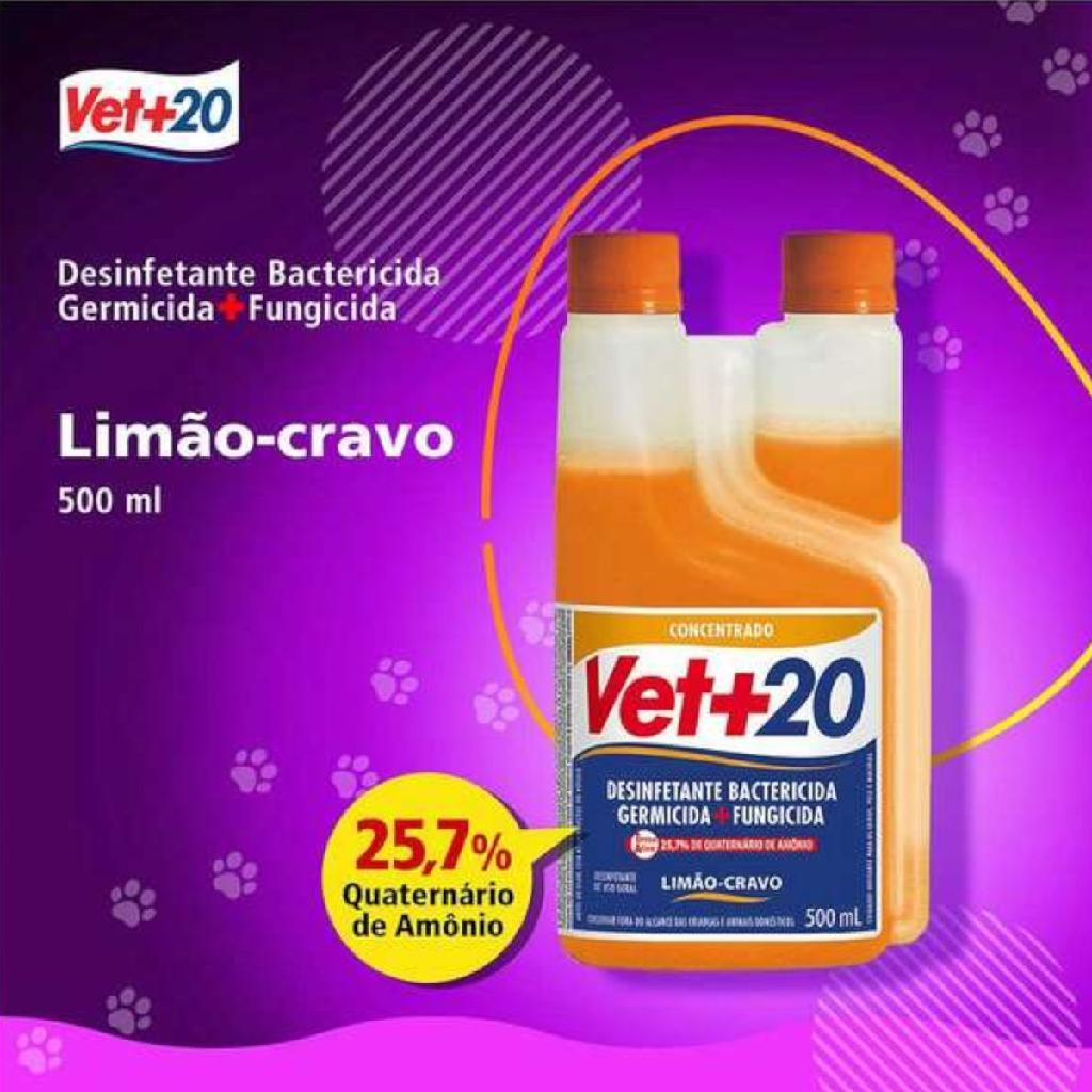 Desinfetante Bactericida Concentrado Vet+20 O Desinfetante Bactericida Concentrado Vet+20 é um bactericida germicida + fungicida concentrado para a desinfecção de hospitais, clínicas médicas, clínicas veterinárias, canis, restaurantes, condomínio, quintais, cozinhas industriais, vasos sanitários, pisos, paredes, metais, uniformes e etc. Com quaternário de amônio, mata bactérias como Salmonella, Choleraesuis, Staphilococus, Aureaus, Eschericia, Coli e Pseudomona, Pseudomona, Aeruginosa, o produto não é corrosivo. FINALIDADE: Para desinfecção e higienização de superfícies em áreas comuns, pisos, paredes, vasos sanitários e metais em geral. Eficaz bactericida, germicida e fungicida. MODO DE USAR: Lave bem os objetos ou utensílios utilizados com medida antes de reutilizá-los. Elimine todo resíduo de sabão na área a ser desinfectada com Vet+20 (o sabão neutraliza a ação bactericida do desinfetante). Produto concentrado. Dilua 10ml do Vet+20 em 6 litros de água. Nesta diluição não é necessário enxaguar. Não aplique em superfície aquecida.