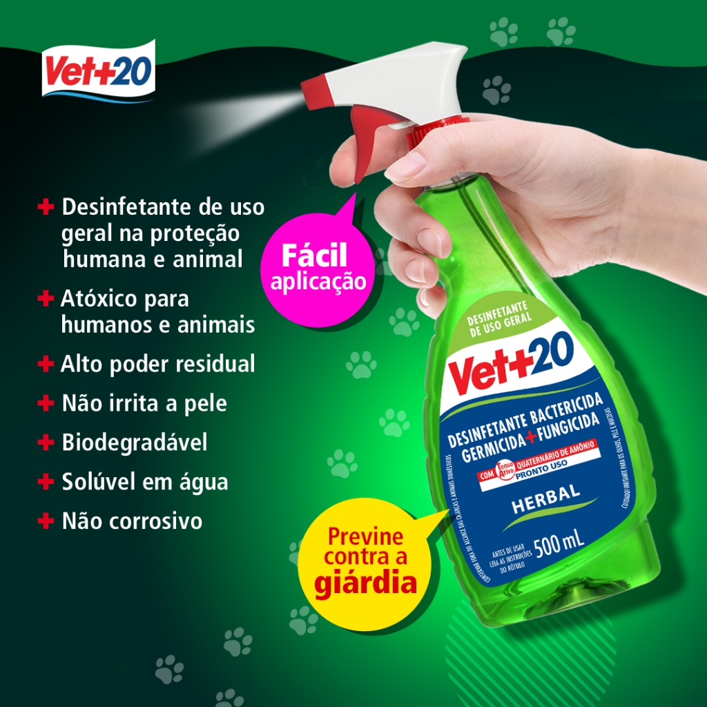 Desinfetante Bactericida Pronto Uso Vet+20 500 mL Desinfetante Bactericida Pronto Uso Vet+20 500 mL é um bactericida germicida + fungicida concentrado herbal para a desinfecção de hospitais, clínicas médicas, clínicas veterinárias, canis, restaurantes, condomínio, quintais, cozinhas industriais, vasos sanitários, pisos, paredes, metais, uniformes e etc. Com quaternário de amônio, mata bactérias como Salmonella, Choleraesuis, Staphilococus, Aureaus, Eschericia, Coli e Pseudomona, Pseudomona, Aeruginosa, o produto não é corrosivo. #Vet+20: A escolha confiável para o bem-estar do seu pet! 🐾 #Vet+20: Onde o cuidado e a excelência se encontram para seu melhor amigo. 🐶❤️ #Vet+20: Cuidando com carinho, tratando com expertise! 🐾💼 #Vet+20: Porque seu pet merece o melhor atendimento possível! 🐱✨ #Vet+20: Levando saúde e felicidade para o mundo dos animais. 🌟🐾 #Vet+20: Aqui, cada pet é tratado com amor e dedicação especial! 🐾❤️ #Vet+20: Transformando consultas em momentos de confiança e conforto. 🏥😊 #Vet+20: O lugar onde a saúde do seu pet é a nossa prioridade número um! 🥇🐾 #Vet+20: Expertise veterinária aliada ao carinho que seu pet merece! 🐶💕 #Vet+20: Unidos para manter seu pet saudável, feliz e cheio de energia! 🐾💪