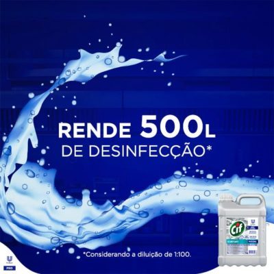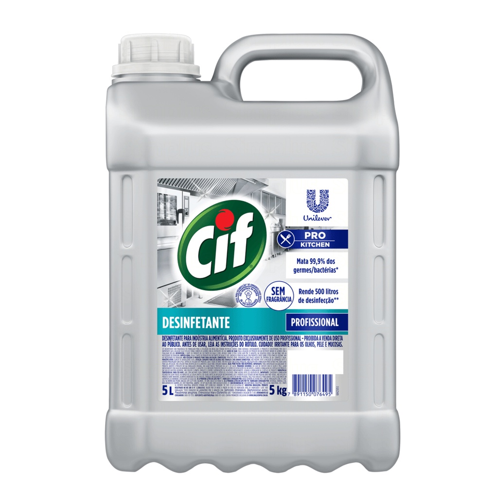 Desinfetante Profissional Sem Perfume 5L Cif Cif Desinfetante 5L é um desinfetante concentrado sem perfume, indicado especialmente para áreas de manipulação de alimentos. O Desinfetante Cif possui fórmula multiuso que proporciona a limpeza das mais diversas superfícies, como mesas, balcões e pisos. O alto desempenho de Cif Desinfetante oferece um rendimento de até 500 litros de desinfecção. Além disso, ele tem eficácia comprovada e aprovada pela Anvisa para utilização em indústrias alimentícias, restaurantes, cozinhas industriais, fast food, padaria, açougue, peixaria, clínicas, escolas, cinemas e shopping centers. Embalagem: 01 galão de 5L