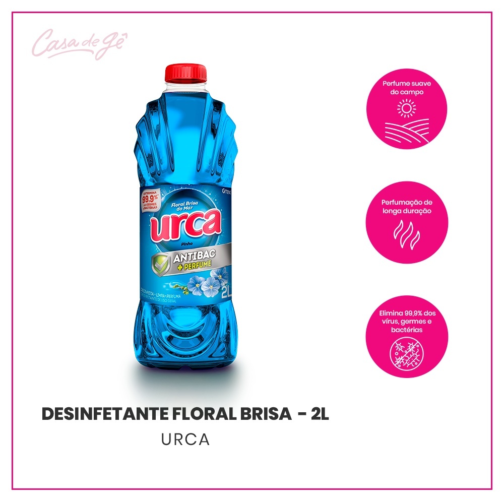 1.Vantagens Ótima relação custo x benefício; Os Desinfetantes Urca Antibac extermina 99,9% dos germes e bactérias* mais encontrados nos domicílios brasileiros. Além de uma excelente performance de limpeza, deixa o ambiente super perfumado! Com os Desinfetantes Urca é proteção e perfume para a casa toda! *Contra as bactérias Staphylococcus Aureus e Salmonella Choleraesuis 2.Características do produto (medidas/especificar quando houver variação do mesmo produto) Se você busca saber como escolher um bom desinfetante, seus problemas acabaram. Urca entende o seu dia a dia e sabe que uma casa livre de germes e bactérias também é uma questão de saúde familiar. Os desinfetantes são pensados para quem precisa de facilidade, comodidade e qualidade. Eles limpam, desinfetam e perfumam ao mesmo tempo. Barreira de proteção e perfume! Detalhes técnicos: Unidade: 2L Desinfetante Urca Antibac Floral Brisa Dimensões da embalagem: 10,8cm(L)x10,7cm(P)x31,1cm(A) Vida útil: 24 meses 3.Composição (do que é feito o produto)/ Especificações técnicas Ativo Tensoativo Não Iônico Sequestrante Corantes Fragrância Conservante Acidificante Veículo Componente Ativo: Cloreto De Alquil Dimetil Benzil Amônio 0,2% P/P Descrição Longa 4. Modo de usar (o da embalagem) Modo de usar: 1. Diluir 3 colheres de sopa (30ml) do produto para cada litro de água na limpeza de pisos, pias e azulejos laváveis. 2. Aplicar com pano ou esponja. Não é necessário enxaguar. Desinfecção doméstica: usar o produto puro, deixando em contato com a área, por no mínimo 10 minutos. 5. Dica de Gê Para garantir a desinfecção completa, o Desinfetante Urca Antibac deve ser utilizado puro, com o auxílio de um pano limpo e seco. Após a aplicação, deixe o produto agir por 10 minutos e não precisa enxaguar. Os Desinfetantes Urca limpam e deixam os ambientes com um perfume delicioso! Com os Desinfetantes Urca você tem a solução completa para os cuidados da casa num único produto.