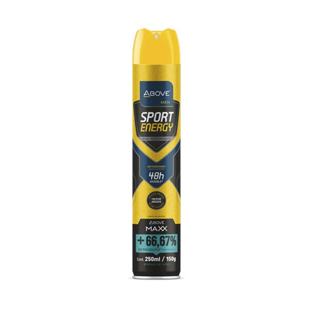 Desod Above Aero 250Ml Maxx Sport Energy Men ABOVE SPORT ENERGY - MEN Sinta a energia e a refrescância na pele com o Antitranspirante Above Men Sport Energy. Com uma fragrância floral amadeirada, frescor imediato e alta performance, ele cuida do seu corpo para você ir além em suas atividades. - 48h de proteção - Livre de álcool e triclosan - Alta performance em situações desafiadoras - Fragrância inconfundível