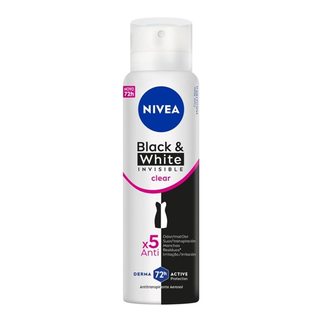 O que é? NIVEA Desodorante Aerossol Black & White INVISIBLE Clear é um desodorante aerossol que promove máxima proteção de NIVEA contra o suor, mau odor, manchas, resíduos nas roupas e irritação, além de proteger a pele. Deixa as axilas suaves e macias, é fácil de aplicar, e possui proteção dermatologicamente testada. Para que serve? NIVEA Desodorante Aerossol Black & White INVISIBLE Clear proporciona a melhor proteção contra manchas e suor. Sua fórmula é 5x anti odor, suor, manchas, resíduos nas roupas e irritação na pele, com proteção prolongada de 72 horas. Evita manchas brancas em roupas pretas e manchas amarelas em roupas brancas. Benefícios e diferenciais: Anti-manchas com proteção de 72 horas A melhor proteção contra manchas e suor Fácil de aplicar Dermatologicamente testado Cuidado suave