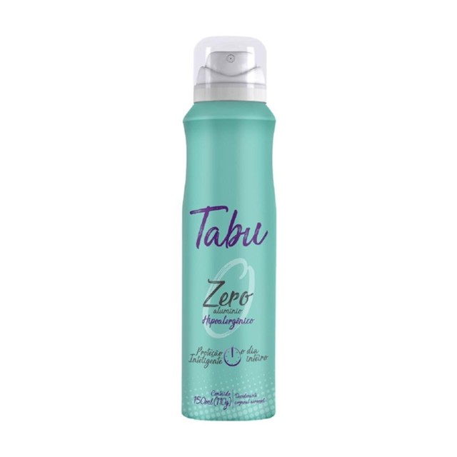 Ação seletiva contra as bactérias causadoras do mau odor, deixando sua pele mais saudável e perfumada. O Tabu Zero Alumínio controla o odor sem bloquear o suor, respeitando o equilíbrio natural da sua pele. O desodorante é hipoalérgico, foi formulado de maneira a minimizar possível surgimento de alergia. Sem manchas - Evita o aparecimento de manchas brancas nas roupas pretas e amarelas nas roupas brancas. Com glicerina vegetal que auxilia na hidratação da sua pele. Modo de uso: AGITE BEM ANTES DE USAR. Aplicar a uma distância de no mínimo 15 cm da pele, para que você tenha um spray suave, que não incomode e nem agrida sua pele.