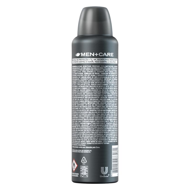• O Desodorante Aerosol Dove Men+Care Clinical Cuidado Total garante máxima proteção* contra o suor e mau odor • Desodorante clinical antitranspirante projetado para 96h de proteção contra o suor e mau odor, com uma fragrância refrescante e de longa duração • Desodorante aerosol para homens que procuram uma maior proteção antitranspirante combinada com tecnologia hidratante que não irrita a pele • Desenvolvido para ser um desodorante antitranspirante de uso diário para homens, ajudando você a se sentir revigorado, confortável e confiante o dia todo • Desodorante aerosol com 1/4 de tecnologia hidratante potente contra o suor, que ajuda a proteger a pele, reduzindo o risco de irritações • Desodorante ideal para homens que, além de hidratar a pele, contém uma agradável fragrância que o mantém refrescado e seco o dia todo O Desodorante Aerosol Dove Clinical Men+Care Cuidado Total oferece máxima proteção* de 96 horas que mantém você refrescado e seco durante o dia todo, além de contar com uma fragrância de longa duração. Este desodorante foi desenvolvido para ser usado diariamente, ajudando a se sentir revigorado, confiante e confortável o dia inteiro. O que faz de um antitranspirante o aliado perfeito para o dia a dia? Para nós, é a união entre eficiência e cuidado. É por isso que a linha de antitranspirantes Dove Clinical Men+Care combina uma avançada fórmula, que contém 1/4 de tecnologia hidratante, que protege sua pele contra irritação. Dove Clinical Men+Care tem o que você precisa para se sentir sempre confiante e com uma agradável sensação de frescor que dura o dia inteiro. Para obter o máximo do seu Desodorante Aerosol Dove Clinical Men+Care Cuidado Total, agite a embalagem para ativar os ingredientes. Segure-a voltada para cima a 15 cm das suas axilas e aplique um jato de dois segundos em cada uma. Experimente os desodorantes, sabonetes, shampoos, gel e espumas de barbear da Dove Men+Care e conheça um novo jeito de se cuidar. Dove Men+Care celebra uma nova definição de força masculina, em que o cuidado com o bem-estar do seu corpo é o centro de tudo. Dove Men+Care é certificada Cruelty-Free pela PETA, sendo assim, você pode confiar que não realizamos e nem realizaremos testes em animais em nenhum lugar do mundo. Além disso, a lata do nosso antitranspirante é feita de metal reciclável e o produto não danifica a camada de ozônio. *a máxima proteção contra suor oferecida por Dove.