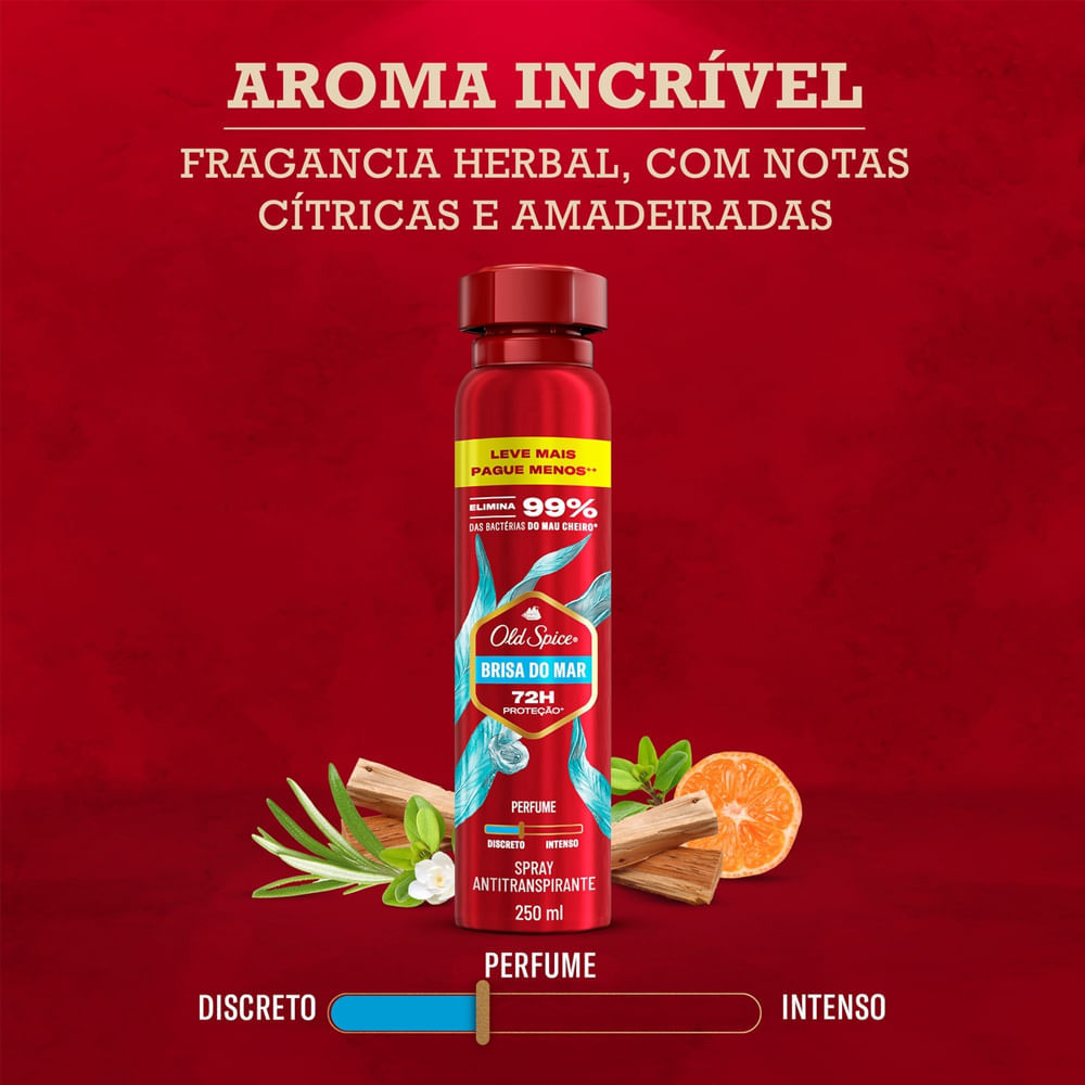 O Desodorante Aerosol Old Spice Brisa Do Mar 250ml proporciona um toque de exclusividade, oferecendo proteção contra o suor e o mau cheiro. Ao utilizar este produto, você se sentirá revigorado e preparado para enfrentar o dia com confiança. É um desodorante desenvolvido especialmente para homens, com fragrância inspirada na força do mar. Além disso, elimina 99% das bactérias do mau cheiro, com base em testes realizados com bactérias específicas, mantém você longe do cheiro de cecê ou suor. Benefícios:48 horas de proteção contra o suor e o mau cheiro;Fragrância fresca com notas inspiradas no mar;Aplicação em spray com toque seco e rápida absorção;Sensação de limpeza e frescor prolongado;Ideal para homens que preferem aromas leves e energizantes. Modo de usar: Agite bem antes de usar. Aplique diretamente nas axilas a uma distância de aproximadamente 15 cm. Deixe secar completamente antes de se vestir. Sobre a marca: Old Spice para homens surgiu em 1938, criado por William Lightfoot Schultz e sua primeira essência permanece lendária. Em 1990 começou a ser fabricado pela P&G onde sofreu algumas alterações e é um sucesso de vendas em vários países. Nos EUA este desodorante é o mais procurado pelos homens no mercado popular.