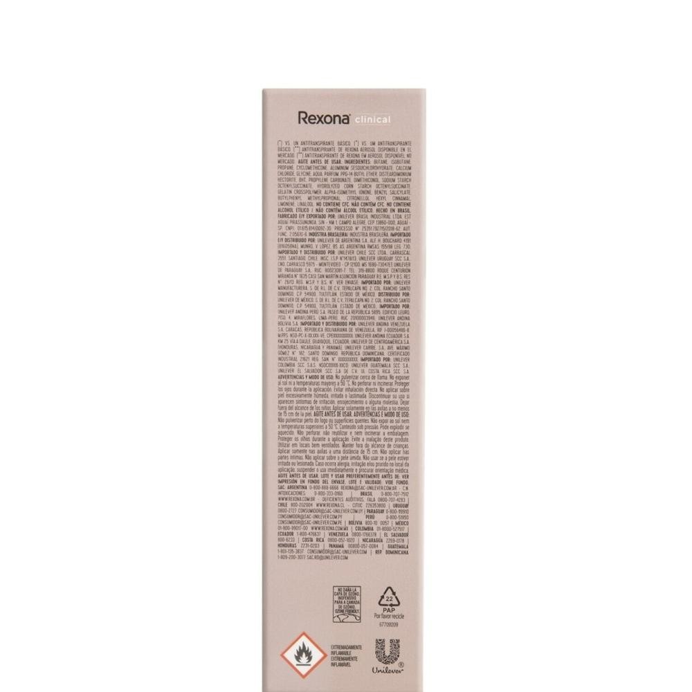 O Desodorante Feminino Rexona Women Clinical foi desenvolvido para manter as suas axilas protegidas por 48 horas. Combatendo o excesso de transpiração, ele desempenha ação que protege 3 vezes mais que um antitranspirante comum. Formam uma camada protetora sobre as glândulas sudoríparas, reduzem o suor e combatem o mau odor. Seu uso é perfeito para mulheres que têm um dia corrido e não abrem mão da segurança e proteção máxima. A pele fica perfumada e fresca graças à liberação de microcápsulas de perfume, dissolvidas gradativamente. Fique protegida mesmo no dia seguinte ou após o banho! Rexona Clinical possui fórmula com tecnologia TriSolid, que se adapta à química do seu corpo. É enriquecida com Dimeticona, que cuida da pele, é dermatologicamente testado e hidrata a cútis, sem agredir.