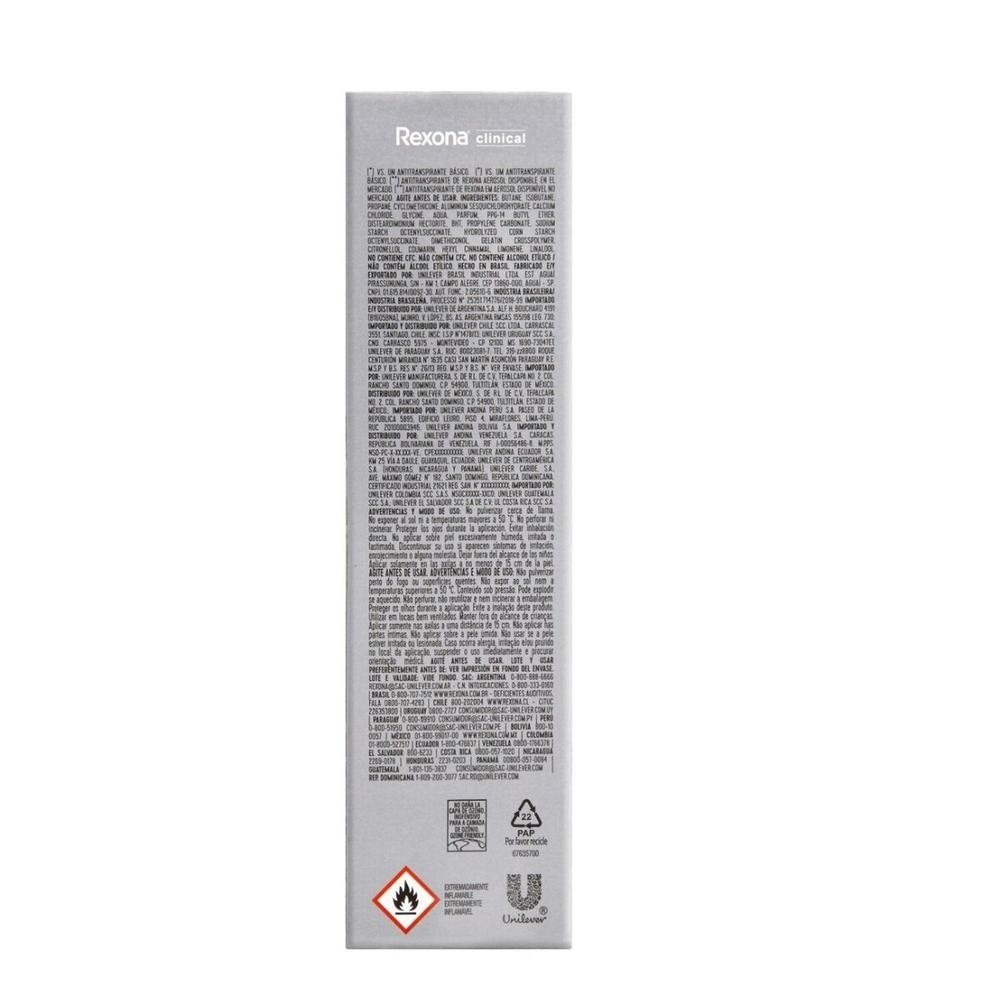 O Desodorante Masculino Rexona Men Clinical é o produto ideal para te deixar seguro contra a transpiração e o mau odor. Ele proporciona proteção avançada que dura até 96 horas, graças a sua tecnologia avançada que forma um micro escudo protetor sobre a pele. É 3 vezes mais potente contra o suor e traz em sua fórmula a tecnologia MotionSense, que se ativa com o movimento. Basta apenas uma aplicação para se sentir protegido durante todo o dia, com sensação de refrescância prolongada.