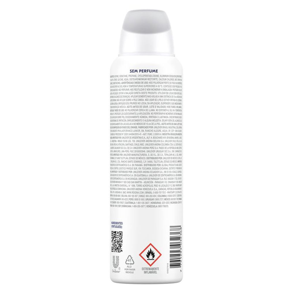 • O Desodorante Antitranspirante Aerosol Rexona Sem Perfume oferece 72 horas de proteção que se adapta a você;• Este antitranspirante possui um controle inteligente do odor e suor, com proteção que se ativa com o calor do seu corpo;• Desenhado para combater o suor que causa o mau odor e manter você fresca e confiante o dia todo;• O antitranspirante feminino Rexona Sem Perfume possui uma formulação com 0% de álcool etílico e sem fragrância;• Desodorante com fórmula dermatologicamente testada, protege você e é gentil com sua pele;• Este desodorante antitranspirante não afeta a camada de ozônio, possui lata em alumínio 100% reciclável e é feito com energia elétrica 100% renovável. Conheça o novo Desodorante Antitranspirante Aerosol Rexona Sem Perfume, desenvolvido para garantir controle inteligente do suor e do mau odor. Com tecnologia que se ativa com o calor do seu corpo, ele oferece 72 horas de proteção contínua, adaptando-se ao seu ritmo e às condições da sua pele para manter você seca, fresca e confiante ao longo do dia. Sua fórmula avançada foi desenhada para se adaptar às condições das axilas, a fim de proporcionar um controle altamente eficiente do suor e do odor por 72h. Atua em sincronia com a resposta natural do suor do corpo para fornecer controle eficaz da umidade, adaptando-se ao pH do corpo para formar uma barreira que combate o suor. A prevenção do suor prejudica o crescimento de bactérias causadoras de odores, o que leva a um controle eficaz do odor, mesmo nos momentos mais intensos. Sua formulação possui 0% de álcool etílico e é sem fragrância para não competir com o seu perfume. Este produto é gentil com a sua pele, pois é dermatologicamente testado. Para melhores resultados, agite bem antes de usar e aplique nas axilas secas a uma distância de 15 cm. Este desodorante antitranspirante não afeta a camada de ozônio, possui lata em alumínio 100% reciclável e é feito com energia elétrica 100% renovável.