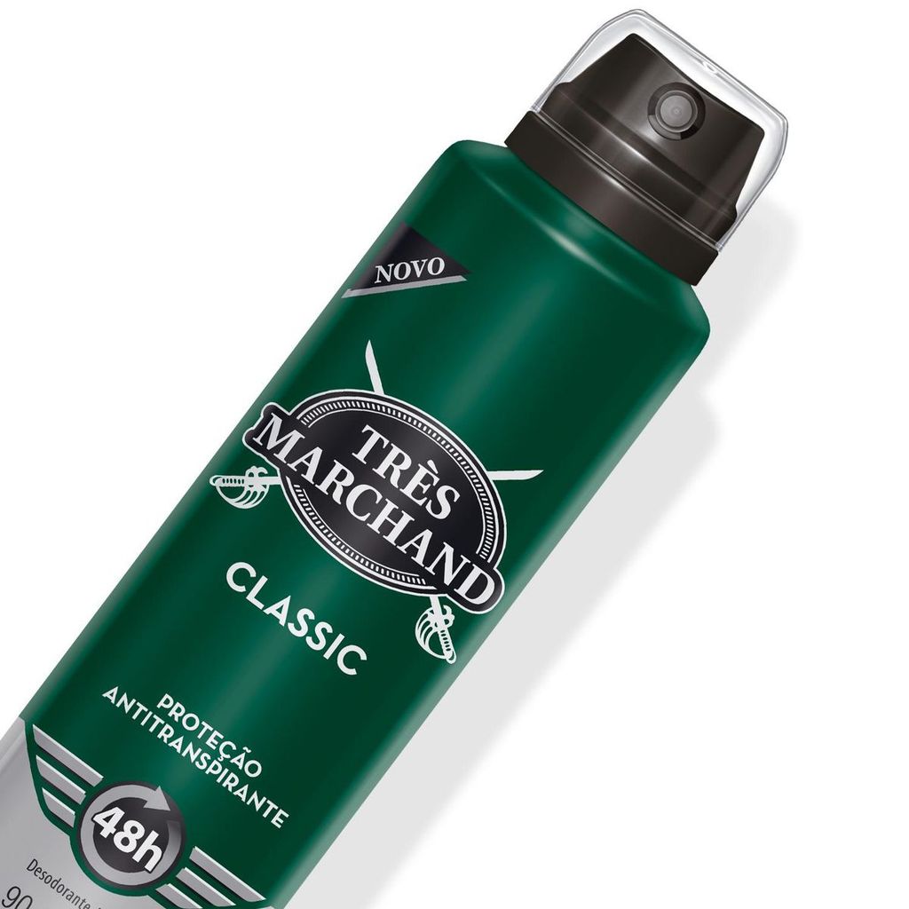 O Desodorante Aerosol Tres Marchand Classic foi especialmente desenvolvido com notas Cítricas, com um leve toque amadeirado destacando assim personalidade masculina. Sua Fórmula proporciona 48 horas de proteção, deixando uma sensação de segurança e bem estar durante o dia, Além de possuir Fórmula antitranspirante. Benefícios: - Anti manchas; - Fragrância agradável; - 48hs de proteção. - Fórmula antitranspirante. Modo de usar: Agite antes de usar. Pulverizar a 15 cm de distância da região onde for aplicado. Sobre a marca: A Tres Marchand é uma marca tradicional da higiene masculina, com produtos de alta qualidade e fragrâncias de Perfumaria Fina, há mais de 20 anos vem oferecendo com seus desodorantes, proteção da pele evitando odores desagradáveis causados pelo suor. Disponível Também em Versão Spray.