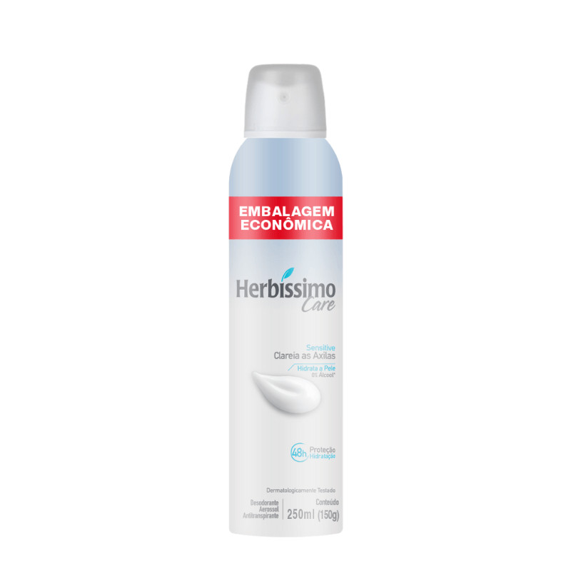 Desodorante Aerossol Antitranspirante Herbíssimo Care Sensitive é formulado com uma exclusiva tecnologia clareadora que cuida da pele, promovendo uma aparência uniforme e mantendo as axilas lindas e saudáveis. Ele clareia as axilas, hidrata a pele e oferece 48 horas de proteção e hidratação, sendo dermatologicamente testado e livre de álcool. Especificações:0% ÁlcoolProteção e hidratação por 48 horas Dermatologicamente testadoPrecauções:Inflamável. Não pulverizar perto do fogo.Não perfurar nem incinerar.Não expor ao sol nem a temperaturas superiores a 50ºC.Usar somente nas axilas e proteger os olhos durante a aplicação.Manter fora do alcance de crianças.Evitar inalação deste produto.Usar somente nas áreas indicadas.Não aplicar sobre a pele irritada ou lesionada.Caso ocorra irritação e/ou prurido no local da aplicação, suspender o uso imediatamente.Não deixar embalagem de aerossol dentro de veículo, pois há risco de vazamento e explosão.Importante: Inofensivo para a camada de ozônio. Não contém CFC.Uso externo. Não ingerir.