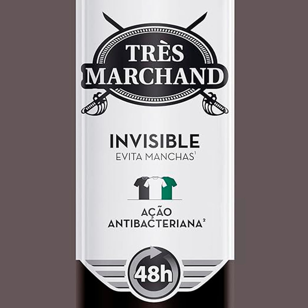 O Desodorante Aerossol Antitranspirante Très Marchand Invisible proporciona um toque de sensualidade, ideal para o dia e principalmente à noite. Sua Fórmula proporciona 48 horas de proteção, deixando uma sensação de segurança e bem estar durante o dia, Além de possuir Formula antitranspirante. Conta ainda com ação invisible anti-machas. Sobre a marca: A Tres Marchand é uma marca tradicional da higiene masculina, com produtos de alta qualidade e fragrâncias de Perfumaria Fina, há mais de 20 anos vem oferecendo com seus desodorantes, proteção da pele evitando odores desagradáveis causados pelo suor.