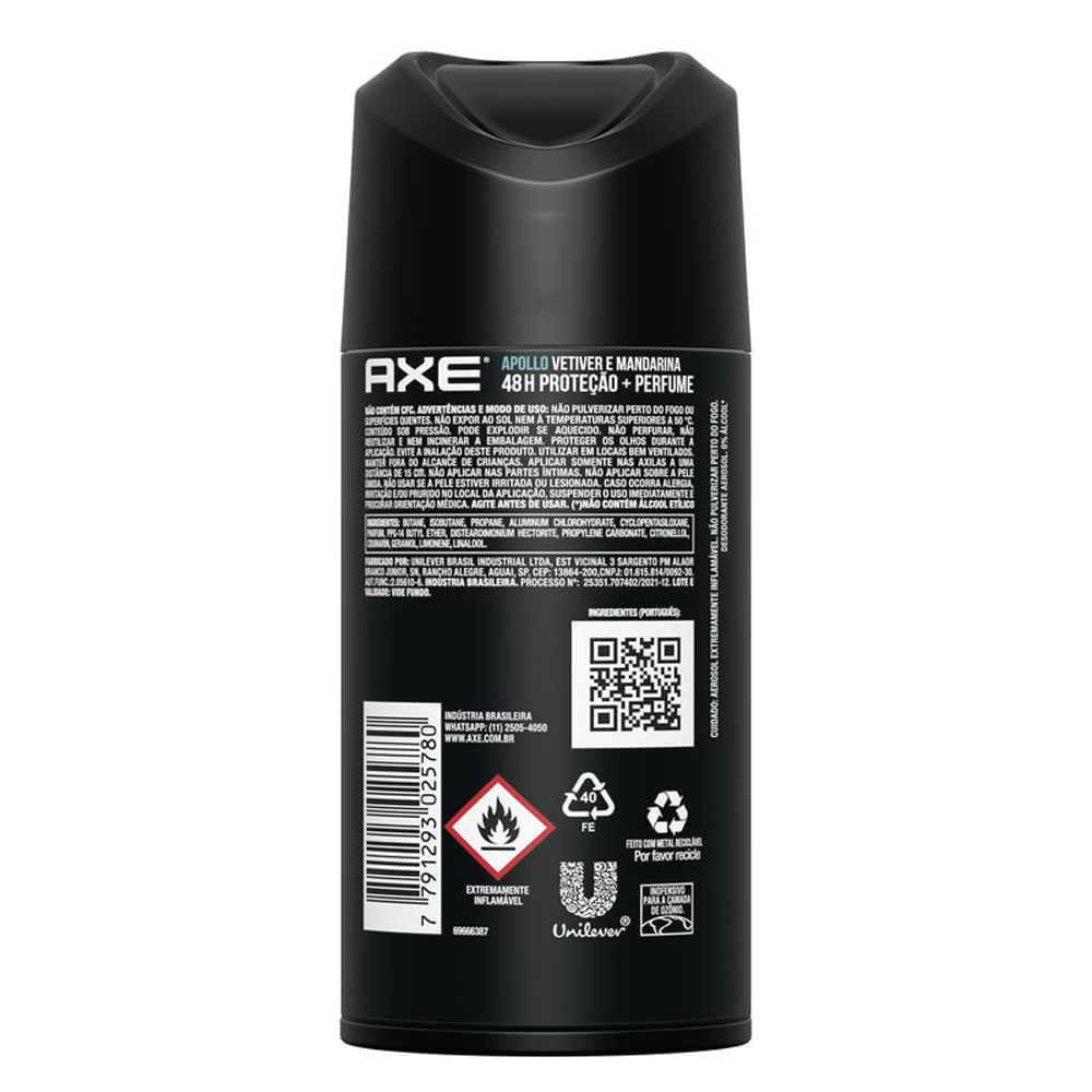 • A nova fórmula do Antitranspirante Aerosol Axe Apollo te mantém protegido e fresco o dia inteiro.• Antitranspirante Aerosol que te protege contra o suor e o mau odor por 48h, além de possuir um perfume irresistível.• A fragrância deste antitranspirante reúne uma excelente combinação de vetiver e tangerina para uma sensação de frescor e proteção de longa duração contra o mau odor. É também formulado com 0% álcool* • Agite bem o antitranspirante Axe Apollo antes de cada uso, aplique somente nas axilas a uma distância de 15 cm e sinta a diferença! • Este antitranspirante aerossol Axe vem com um novo design numa embalagem feita com me al reciclável, por favor recicle ela também. • Antitranspirante Axe Apollo, te mantém com um perfume tão irresistível quanto um deus grego, todos os dias. Com a nova fórmula do Antitranspirante Aerosol Axe Apollo, com uma mistura perfeita de vetiver e tangerina, você se sentirá mais incrível, fresco e protegido todo o dia. Sua fórmula com 0% álcool* garante proteção contra o mau odor por até 48h e possui um perfume irresistível com notas cítricas para uma sensação de frescor que dura o dia inteiro. Para aplicar, agite bem o antitranspirante Axe Apollo antes de cada uso, aplique somente nas axilas a uma distância de 15 cm e sinta a diferença! As fragrâncias vetiver e mandarina te deixam totalmente fresco e 100% pronto para o que quer que você faça. A lata do antitranspirante Aerosol Axe Apollo vem com um novo design numa embalagem com metal infinitamente reciclável, e para manter este ciclo, por favor recicle também ela! Não contém CFC, sendo inofensivo para a camada de Ozônio. Não importa o que aconteça, você está pronto, mais fresco e o planeta mais limpo. Axe foi criado para ajudá-lo a ser o seu melhor, tanto no trabalho quanto na sua vida pessoal. É um antitranspirante de longa duração, o que significa que você ficará perfumado ao longo do dia, mantendo seu estilo e sua confiança. Experimente também outras fragrâncias dos antitranspirantes Axe. *Não contém álcool etílico.