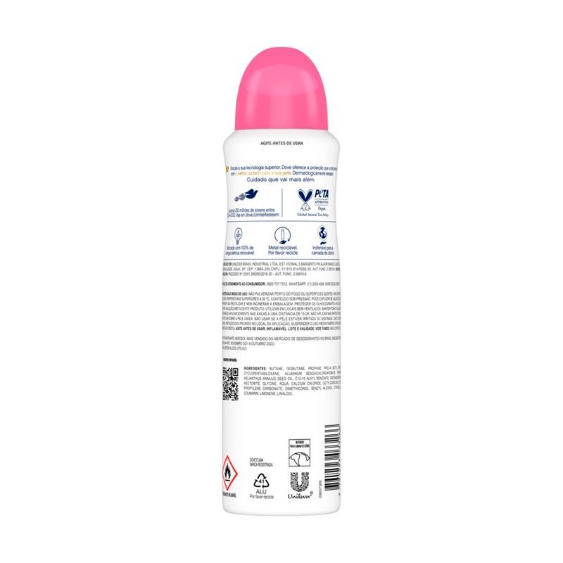 • O Desodorante Antitranspirante Aerosol Dove Go Fresh Romã e Verbena possui uma deliciosa e refrescante fragrância que dura o dia todo. • Com tecnologia superior, o antitranspirante Dove garante proteção contra o suor e mau odor por até 72h, dando uma sensação de limpeza e frescor revitalizante. • Dove Romã e Verbena é um desodorante antitranspirante sem álcool em sua fórmula. • Este desodorante aerosol de rápida absorção e delicado para suas axilas é o número 1 em cuidado para a sua pele • Contém ¼ de creme hidratante e vitamina E, além de uma agradável fragrância de romã e verbena. • Dove não realiza testes em animais, sendo certificada como Cruelty-Free pela PETA. Este aerosol é vegano, não danifica a camada de ozônio e nossas latas são feitas de metal reciclável Número 1 em cuidado, o Desodorante Antitranspirante Aerosol Dove Go Fresh Romã e Verbena é o preferido das nossas consumidoras. Feito com tecnologia superior, ele cuida e protege das axilas por 72 horas contra suor e mau odor, mantendo as axilas secas o dia todo. Formulado com 1/4 de creme hidratante e vitamina E, ajuda a manter a hidratação da pele das axilas, deixando-a suave e macia. O desodorante Dove Go Fresh é sem álcool** e gentil com sua pele. Além de proteger contra suor e mau odor, possui uma fragrância de romã e verbena, oferecendo uma sensação de limpeza e frescor revitalizante. Dove proporciona proteção eficaz e cuidado para a pele das axilas, para que você possa se libertar de qualquer desconforto e se sentir confiante o dia todo. Para uma melhor proteção contra marcas de suor e irritação da pele, siga estas dicas: após o banho, garanta que as axilas estão bem secas; para obter o máximo do seu Desodorante Antitranspirante Aerosol Dove Go Fresh Romã e Verbena, agite a embalagem para ativar os ingredientes; segure-a voltada para cima a 15 cm das suas axilas e aplique um jato de dois segundos em cada uma. Dove é certificada Cruelty-Free pela PETA, sendo assim, não realizamos e nem realizaremos testes em animais em nenhum lugar do mundo. Além disso, nosso antitranspirante é vegano, fabricado com energia elétrica 100% renovável, nossa lata é feita de metal reciclável e o produto não danifica a camada de ozônio. Antitranspirante Aerosol mais vendido do mercado de desodorantes no Brasil. Não contém álcool etílico.
