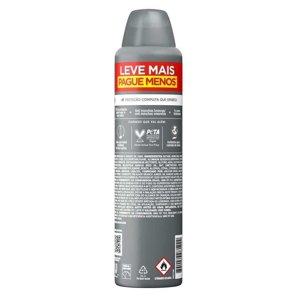 • O Desodorante Aerosol Dove Men+Care Invisible Dry 250 ml é um antitranspirante que protege suas roupas contra machas brancas, testado em 100 cores • Antitranspirante masculino com 1/4 de creme hidratante. Proteção contra o suor, o mau odor e contra manchas nas roupas • Antitranspirante aerosol com 72h de proteção contra o suor e mau odor e fragrância que dura o dia todo • Antitranspirante masculino, 72h de proteção e um toque a mais de cuidado com 1/4 de creme hidratante • Antitranspirante aerosol sem álcool e com tecnologia Tripla Ação que ajuda a proteger a pele, reduzindo o risco de irritações • Este antitranspirante é o formato mais sustentável de Dove aerosol. Leve mais, pague menos* O antitranspirante Aerosol Dove Men+Care Invisible Dry foi testado em 100 cores para garantir proteção contra manchas brancas, além de uma proteção de 72 horas que te mantém seco e protegido contra o suor e mau odor o dia todo. Além de garantir a proteção que você espera de Dove Men+Care, o Desodorante Invisible Dry 250 ml é mais econômico, onde você leva mais produto e paga menos*. O que faz de um antitranspirante o aliado perfeito para o dia a dia? Para nós, é a união entre proteção e cuidado. É por isso que a linha de antitranspirantes Dove Men+Care combina uma avançada fórmula, que contém ¼ de creme hidratante, com a tecnologia Tripla Ação que protege a sua pele contra irritação. Dove Men+Care tem o que você precisa para se sentir sempre seguro e com uma agradável sensação de frescor que dura o dia inteiro. Para obter o máximo do seu Desodorante Aerosol Dove Men+Care Invisible Dry, agite a embalagem para ativar os ingredientes. Segure-a voltada para cima a 15 cm das suas axilas e aplique um jato de dois segundos em cada uma. Experimente os desodorantes, sabonetes e shampoos Dove Men+Care e conheça um novo jeito de se cuidar. Dove Men+Care celebra uma nova definição de força masculina, em que o cuidado com o bem-estar do seu corpo é o centro de tudo. Dove Men é certificada Cruelty-Free pela PETA, sendo assim, você pode confiar que não realizamos e nem realizaremos testes em animais em nenhum lugar do mundo. Além disso, nosso antitranspirante é fabricado com energia elétrica 100% renovável, nossa lata é feita de metal reciclável e o produto não danifica a camada de ozônio. *quando comparado à versão de 150 ml