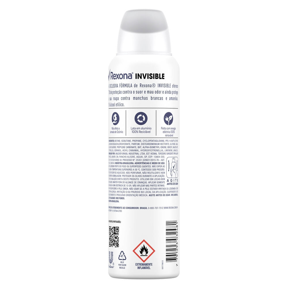 Desodorante Antitranspirante Aerossol Feminino Rexona Invisible 72 horas • A exclusiva fórmula do Desodorante Aerosol Feminino Rexona Invisible garante 72 horas de proteção contra o suor e o mau odor