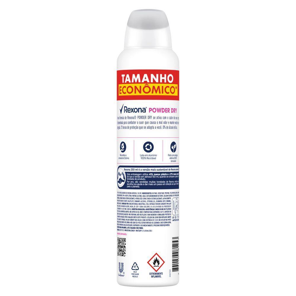 • O Desodorante Antitranspirante Aerosol Feminino Rexona Powder Dry possui nova fórmula: 72 horas de proteção contra a transpiração e o mau odor, ativada pelo movimento • O novo desodorante feminino Rexona responde diretamente ao seu movimento, mantendo você seca, fresca e protegida como nunca • A fragrância do Desodorante Antitranspirante Aerosol Feminino Rexona Powder Dry contém uma rica combinação de jasmin e baunilha, garantindo a sensação de frescor durante o dia inteiro • A fórmula do Antitranspirante Aerosol Feminino Rexona Powder Dry é 0% álcool* • Agite antes de usar. Aplicar o Desodorante Feminino Rexona Powder Dry somente nas axilas a não menos de 15 cm da pele • Este desodorante antitranspirante não afeta a camada de ozônio, possui lata em alumínio 100% reciclável e é feito com energia elétrica 100% renovável Mais uma vez Rexona se supera e relança sua linha de desodorantes com uma fórmula inovadora, que combina um novo e exclusivo ativo antitranspirante com a tecnologia de fragrâncias encapsuladas. O resultado? O Desodorante Antitranspirante Aerosol Feminino Rexona Powder Dry garante 72 horas de proteção ativada pelo seu movimento e muito mais confiança para você encarar qualquer desafio. Com o registro de 16 patentes e mais de 300 testes técnicos, está comprovado que essa nova tecnologia antitranspirante entrega um nível de proteção contra o suor como nenhuma outra proposta regular já entregou antes. A nova e exclusiva fórmula de Rexona Powder Dry trabalha com um sistema de partículas menores e mais estáveis, que formam uma barreira protetora mais resistente e duradoura contra a transpiração e o mau odor, mantendo você seca, fresca e protegida a cada novo movimento e por muito mais tempo. Sua fragrância contém uma rica combinação de jasmin e baunilha, garantindo a sensação de frescor durante o dia inteiro. Este desodorante feminino antitranspirante não afeta a camada de ozônio, possui lata em alumínio 100% reciclável e é feito com energia elétrica 100% renovável. Modo de usar: Agite antes de usar. Aplicar somente nas axilas a não menos de 15 cm da pele. Sua fórmula é 0% álcool*. Além da nova fórmula, o novo formato de Rexona aerosol 250 ml é mais econômico, onde você leva mais produto e paga menos**. Ele é o formato mais sustentável de Rexona aerosol, com uma embalagem que utiliza 23% menos metal e 41% menos plástico do que a versão de aerosol 150 ml, quando se compara o gasto por tonelada de produto. Por ano, são vendidas muitas toneladas de Rexona aerosol, então essa escolha nos ajuda a dar mais um passo em direção ao que é melhor para o planeta. Por que Rexona não te abandona. *Não contém álcool etílico. **Quando comparado à versão de 150 ml