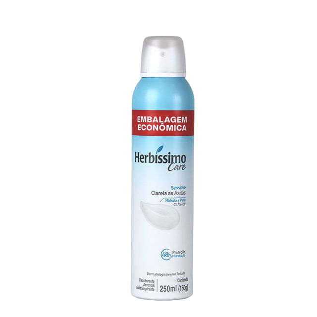 Desodorante Antitranspirante Aerosol Herbíssimo Care Sensitive 250ml O Desodorante Antitranspirante Aerosol Herbíssimo Care Sensitive foi desenvolvido para quem busca proteção prolongada e cuidados especiais com a pele das axilas. Sua fórmula conta com tecnologia clareadora exclusiva, que ajuda a uniformizar o tom da pele, deixando as axilas com aparência mais saudável e bonita. Além de hidratar profundamente, oferece 48 horas de proteção contra o suor e o mau odor, sendo dermatologicamente testado e totalmente livre de álcool, garantindo conforto até mesmo para peles sensíveis. Diferenciais e benefícios Fórmula com tecnologia clareadora para axilas mais uniformes Hidratação intensa e proteção duradoura por até 48 horas Dermatologicamente testado 0% álcool, ideal para peles sensíveis Modo de uso Agite bem antes de usar. Aplique o desodorante a uma distância mínima de 15 cm das axilas, mantendo o jato direcionado para a pele limpa e seca. Precauções Produto inflamável. Não pulverizar próximo ao fogo ou superfícies aquecidas. Não perfurar nem incinerar a embalagem, mesmo após o uso. Evite exposição ao sol e a temperaturas acima de 50°C. Utilize apenas nas axilas, protegendo os olhos durante a aplicação. Manter fora do alcance de crianças. Evitar inalação e não aplicar sobre pele irritada ou lesionada. Caso surjam sinais de irritação ou coceira, interrompa o uso imediatamente. Não deixar a embalagem dentro de veículos, para evitar vazamento ou explosão. Produto seguro para a camada de ozônio, livre de CFC. Uso externo. Não ingerir.
