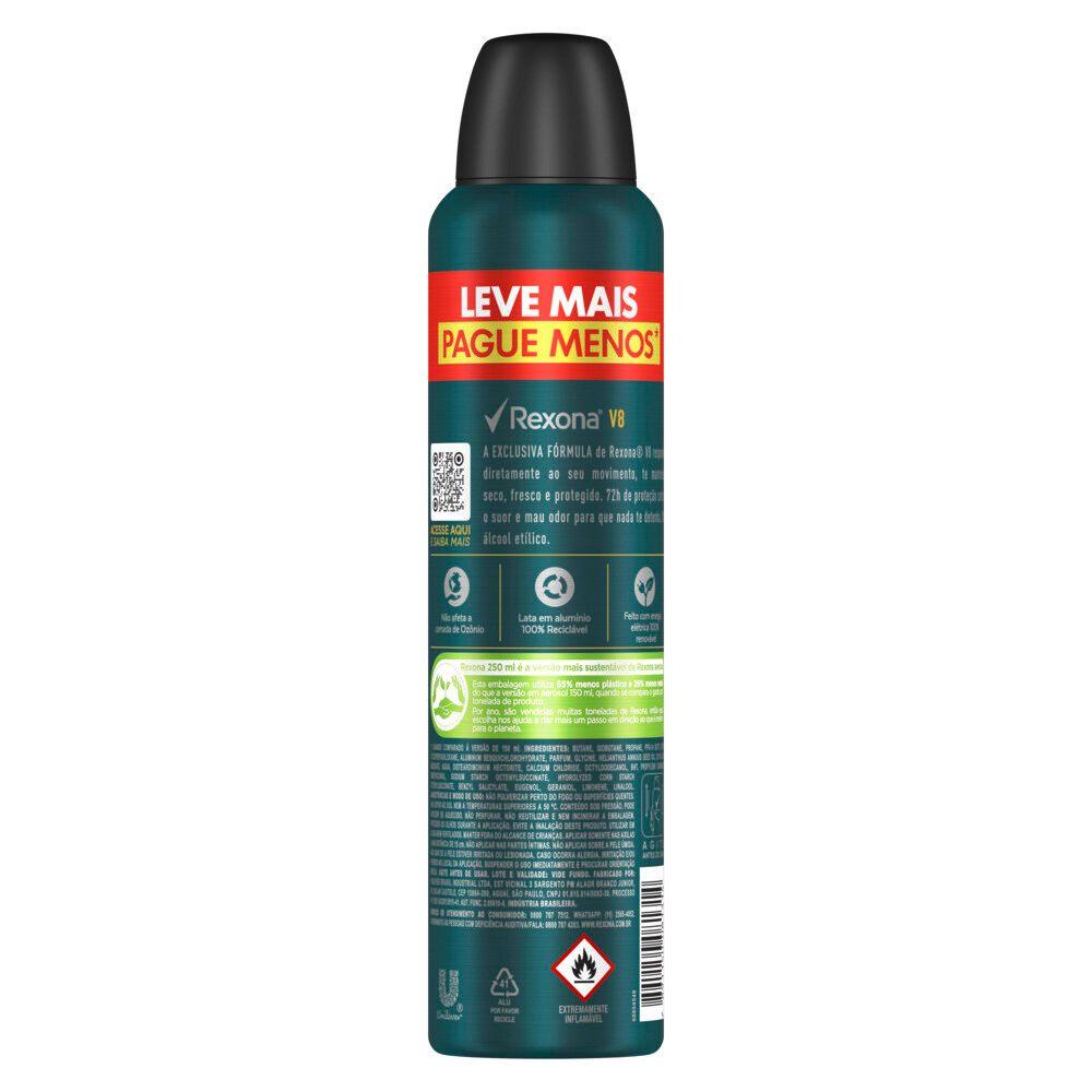 • O Desodorante Antitranspirante Aerosol Masculino Rexona V8 possui nova fórmula: 72 horas de proteção contra a transpiração e o mau odor, ativada pelo movimento • O novo desodorante masculino Rexona responde diretamente ao seu movimento, mantendo você seco, fresco, protegido e pronto para encarar qualquer desafio • A fragrância do Desodorante Antitranspirante Aerosol Masculino Rexona V8 contém uma combinação de notas verdes e amadeiradas, garantindo sensação de frescor durante o dia inteiro • A fórmula do Antitranspirante Aerosol Masculino Rexona Invisible é 0% álcool* • Agite antes de usar. Aplicar o Desodorante Masculino Rexona Invisible somente nas axilas a não menos de 15 cm da pele • Este desodorante antitranspirante não afeta a camada de ozônio, possui lata em alumínio 100% reciclável e é feito com energia elétrica 100% renovável Mais uma vez Rexona se supera e relança sua linha de desodorantes com uma fórmula inovadora, que combina um novo e exclusivo ativo antitranspirante com a tecnologia de fragrâncias encapsuladas. O resultado? O Desodorante Antitranspirante Aerosol Masculino Rexona V8 garante 72 horas de proteção ativada pelo seu movimento e muito mais confiança para você encarar qualquer desafio. Com o registro de 16 patentes e mais de 300 testes técnicos, está comprovado que essa nova tecnologia antitranspirante entrega um nível de proteção contra o suor como nenhuma outra proposta regular já entregou antes. A nova e exclusiva fórmula de Rexona V8 trabalha com um sistema de partículas menores e mais estáveis, que formam uma barreira protetora mais resistente e duradoura contra a transpiração e o mau odor, mantendo você seco, fresco e protegido a cada novo movimento e por muito mais tempo. Este desodorante masculino antitranspirante não afeta a camada de ozônio, possui lata em alumínio 100% reciclável e é feito com energia elétrica 100% renovável. Modo de usar: Agite antes de usar. Aplicar somente nas axilas a não menos de 15 cm da pele. Sua fórmula é 0% álcool*, e sua fragrância contém uma combinação de notas verdes e amadeiradas, garantindo sensação de frescor durante o dia inteiro. Além da nova fórmula, o novo formato de Rexona aerosol 250 ml é mais econômico, onde você leva mais produto e paga menos**. Ele é o formato mais sustentável de Rexona aerosol, com uma embalagem que utiliza 23% menos metal e 41% menos plástico do que a versão de aerossol 150 ml, quando se compara o gasto por tonelada de produto. Por ano, são vendidas muitas toneladas de Rexona aerosol, então essa escolha nos ajuda a dar mais um passo em direção ao que é melhor para o planeta. Por que Rexona não te abandona. *Não contém álcool etílico. **Quando comparado à versão de 150 ml