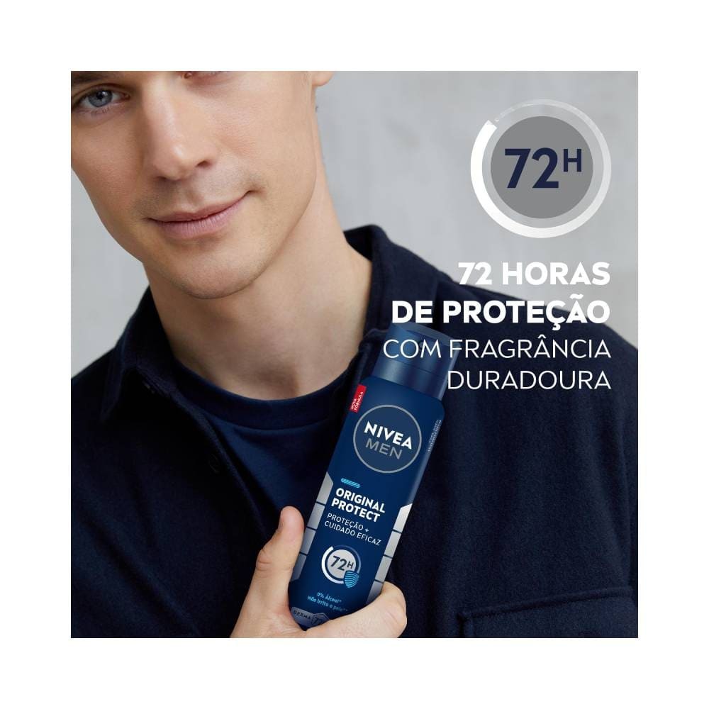 DESODORANTE ANTITRANSPIRANTE AEROSOL NIVEA MEN ORIGINAL PROTECT 150ML ===================================================================== O Desodorante Antitranspirante Aerosol NIVEA Men Original Protect oferece proteção eficaz contra o suor e odores, desenvolvido especialmente para homens. Proporciona até 48 horas de frescor contínuo, mantendo você confiante em qualquer situação. Oferece proteção efetiva contra a transpiração, mantendo a pele seca por até 48 horas contínuas. Possui uma fragrância que confere um aroma agradável e masculino, ideal para o uso diário. PROTEÇÃO PROLONGADA Oferece proteção efetiva contra a transpiração, mantendo a pele seca por até 48 horas contínuas. FRAGRÂNCIA FRESCA E ORIGINAL Possui uma fragrância que confere um aroma agradável e masculino, ideal para o uso diário. MODO DE USO =========== Para melhores resultados, agite bem antes de usar e aplique a uma distância de 15 cm das axilas. Este desodorante é fácil de usar e proporciona proteção duradoura. Agite bem a embalagem antes de cada aplicação para garantir uma distribuição uniforme do produto. Mantenha o spray a 15 cm de distância da pele para uma aplicação eficaz e segura. Aplique um jato curto diretamente nas axilas para proteger contra o suor e odores. Aguarde alguns segundos antes de vestir-se para assegurar que o produto esteja completamente seco. AGITAR Agite bem a embalagem antes de cada aplicação para garantir uma distribuição uniforme do produto. DISTÂNCIA DE APLICAÇÃO Mantenha o spray a 15 cm de distância da pele para uma aplicação eficaz e segura. APLICAÇÃO Aplique um jato curto diretamente nas axilas para proteger contra o suor e odores. AGUARDAR SECAGEM Aguarde alguns segundos antes de vestir-se para assegurar que o produto esteja completamente seco. CARACTERÍSTICAS E BENEFÍCIOS DO DESODORANTE ANTITRANSPIRANTE AEROSOL NIVEA MEN ORIGINAL PROTECT =============================================================================================== O desodorante NIVEA Men Original Protect é eficiente e seguro para o uso diário, proporcionando uma sensação contínua de frescor. É compatível com todos os tipos de pele, incluindo as mais sensíveis. Adequado para todos os tipos de pele, este produto não causa irritações. Conta com um design ergonômico que facilita a aplicação uniforme nas axilas. Desenvolvido sem adição de álcool etílico para minimizar o risco de irritações. Este desodorante possui fórmula testada que garante segurança e eficácia. COMPATÍVEL COM TODOS OS TIPOS DE PELE Adequado para todos os tipos de pele, este produto não causa irritações. EMBALAGEM PRÁTICA EM AEROSOL Conta com um design ergonômico que facilita a aplicação uniforme nas axilas. SEM ÁLCOOL ETÍLICO Desenvolvido sem adição de álcool etílico para minimizar o risco de irritações. TESTADO DERMATOLOGICAMENTE Este desodorante possui fórmula testada que garante segurança e eficácia. ESPECIFICAÇÕES TÉCNICAS ======================= Com formulação avançada, este desodorante equilibra eficácia com suavidade à pele, garantindo proteção prolongada. Tipo de Desodorante: Aerosol Gênero: Masculino Proteção: Até 48 horas contra o suor Composição: Sem álcool etílico Tecnologia Ativa: Testado dermatologicamente SOBRE A MARCA NIVEA =================== A NIVEA é mundialmente reconhecida por seus produtos de cuidados com a pele que oferecem qualidade e eficácia. A marca dedica-se a desenvolver fórmulas inovadoras que atendem às necessidades de diversos tipos de pele. Mais de 100 anos de experiência em cuidados com a pele garantem a qualidade dos produtos NIVEA. Mais de 100 anos de experiência em cuidados com a pele garantem a qualidade dos produtos NIVEA. Desenvolvimento contínuo de produtos que atendem às necessidades do consumidor global. Produtos testados dermatologicamente e com ingredientes de alta qualidade para sua segurança. EXPERIÊNCIA E TRADIÇÃO Mais de 100 anos de experiência em cuidados com a pele garantem a qualidade dos produtos NIVEA. FÓRMULAS INOVADORAS Desenvolvimento contínuo de produtos que atendem às necessidades do consumidor global. COMPROMISSO COM A QUALIDADE Produtos testados dermatologicamente e com ingredientes de alta qualidade para sua segurança.