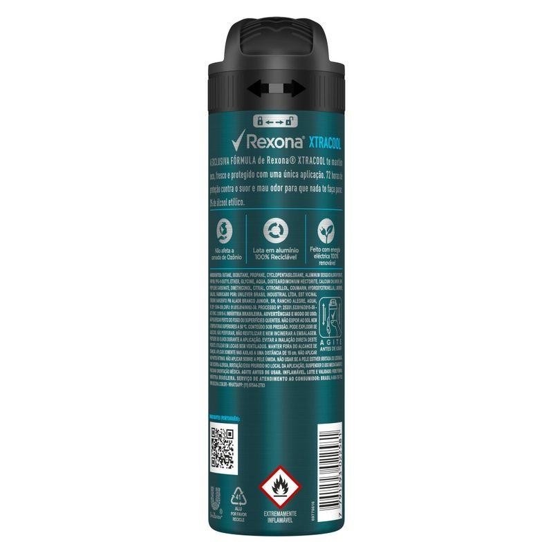 • O Desodorante Antitranspirante Aerosol Masculino Rexona Xtracool possui nova fórmula: 72 horas de controle prolongado de suor • O novo desodorante masculino Rexona te mantém seco, fresco e protegido com uma única aplicação, deixando você pronto para encarar qualquer desafio • A fragrância do Desodorante Antitranspirante Aerosol Masculino Rexona Xtracool é refrescante, garantindo sensação de frescor durante o dia inteiro • A fórmula do Antitranspirante Aerosol Masculino Rexona Xtracool contém 0% de álcool etílico • Agite antes de usar. Aplicar o Desodorante Masculino Rexona Xtracool somente nas axilas a não menos de 15 cm da pele • Este desodorante antitranspirante não afeta a camada de ozônio, possui lata em alumínio 100% reciclável e é feito com energia elétrica 100% renovável Mais uma vez Rexona se supera e relança sua linha de desodorantes com uma fórmula inovadora, que combina um novo e exclusivo ativo antitranspirante, garantindo proteção em uma única aplicação. O Desodorante Antitranspirante Aerosol Masculino Rexona Xtracool garante 72 horas de controle prolongado contra o suor e muito mais confiança, para que nada te faça parar. A nova e exclusiva fórmula de Rexona Xtracool trabalha com um sistema de partículas menores e mais estáveis, que formam uma barreira protetora mais resistente e duradoura contra a transpiração e o mau odor, mantendo você seco, fresco e protegido por muito mais tempo. Este desodorante masculino antitranspirante não afeta a camada de ozônio, possui lata em alumínio 100% reciclável e é feito com energia elétrica 100% renovável. Modo de usar: Agite antes de usar. Aplicar somente nas axilas a não menos de 15 cm da pele. Sua fórmula contém 0% de álcool etílico, e a fragrância deste desodorante é super refrescante, garantindo sensação de frescor durante o dia inteiro. Por ano, são vendidas muitas toneladas de Rexona aerosol, então essa escolha nos ajuda a dar mais um passo em direção ao que é melhor para o planeta. Por que Rexona não te abandona.