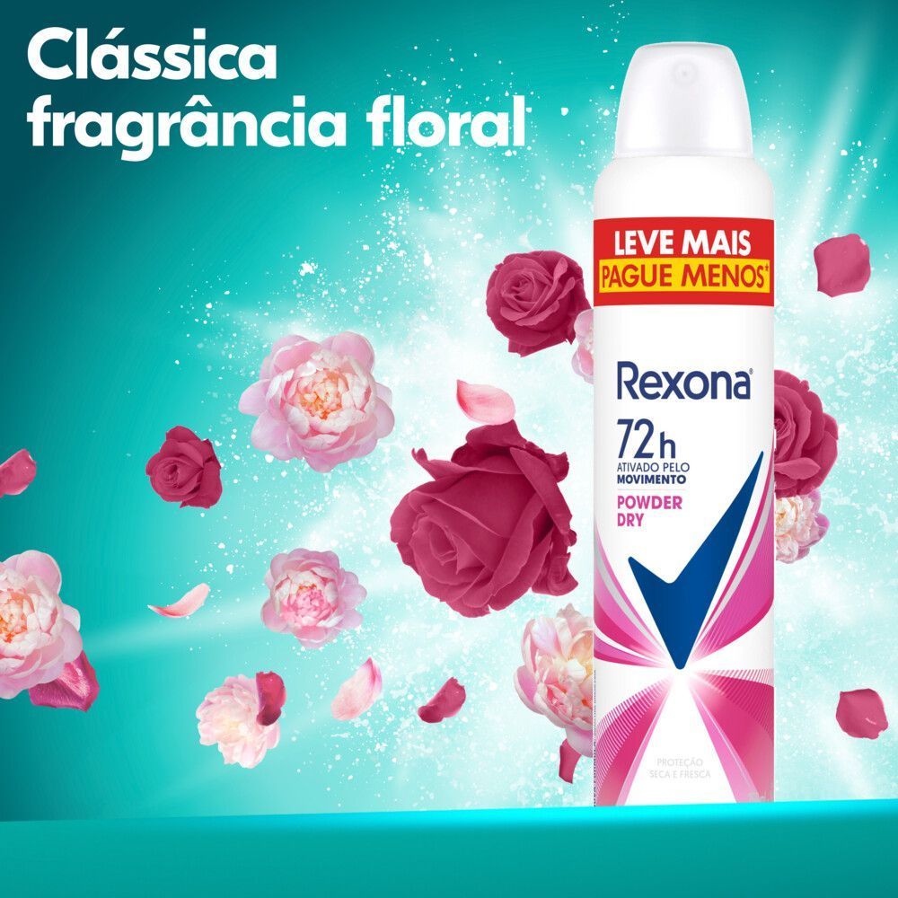 • O Desodorante Antitranspirante Aerosol Feminino Rexona Powder Dry possui nova fórmula: 72 horas de proteção contra a transpiração e o mau odor, ativada pelo movimento • O novo desodorante feminino R
