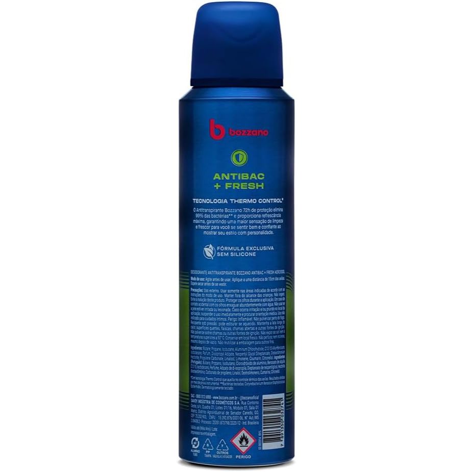 Desodorante Antitranspirante Bozzano Aerossol Antibac+Fresh 150ml Principais Características: • Fórmula antitranspirante que reduz a transpiração e controla odores. • Tecnologia Antibac+Fresh que combate bactérias causadoras do mau cheiro. • Aplicação em aerossol, proporcionando rápida secagem e sensação de frescor. Benefícios: • Mantém a pele seca e protegida por várias horas. • Proporciona sensação de frescor e bem-estar ao longo do dia. • Combate bactérias e odores, mantendo a axila limpa e saudável. • Ideal para uso diário, antes ou depois de atividades físicas. Diferenciais do Produto: • Combina ação antitranspirante com tecnologia antibacteriana. • Marca reconhecida no cuidado masculino, garantindo qualidade e confiança. • Fragrância suave e refrescante que dura ao longo do dia. Especificações Técnicas: • Peso: 150 ml Instruções de Uso: • Agite bem antes de usar. • Aplique sobre a pele limpa e seca, mantendo o aerossol a uma distância de 15 cm da axila. • Evite inalar o produto durante a aplicação. Avisos e Precauções: • Uso externo. • Não aplicar em pele irritada ou lesionada. • Inflamável. Mantenha afastado de fogo, faíscas e superfícies quentes. • Evite contato com olhos e mucosas. • Manter fora do alcance de crianças. O que está incluso? • 1 unidade de Desodorante Antitranspirante Bozzano Aerossol Antibac+Fresh 150ml ---- DÚVIDAS FREQUENTES ---- Os produtos são originais? Sim. Todos os nossos produtos são originais. Emitem nota fiscal? Sim. Emitimos nota fiscal para todos os pedidos.
