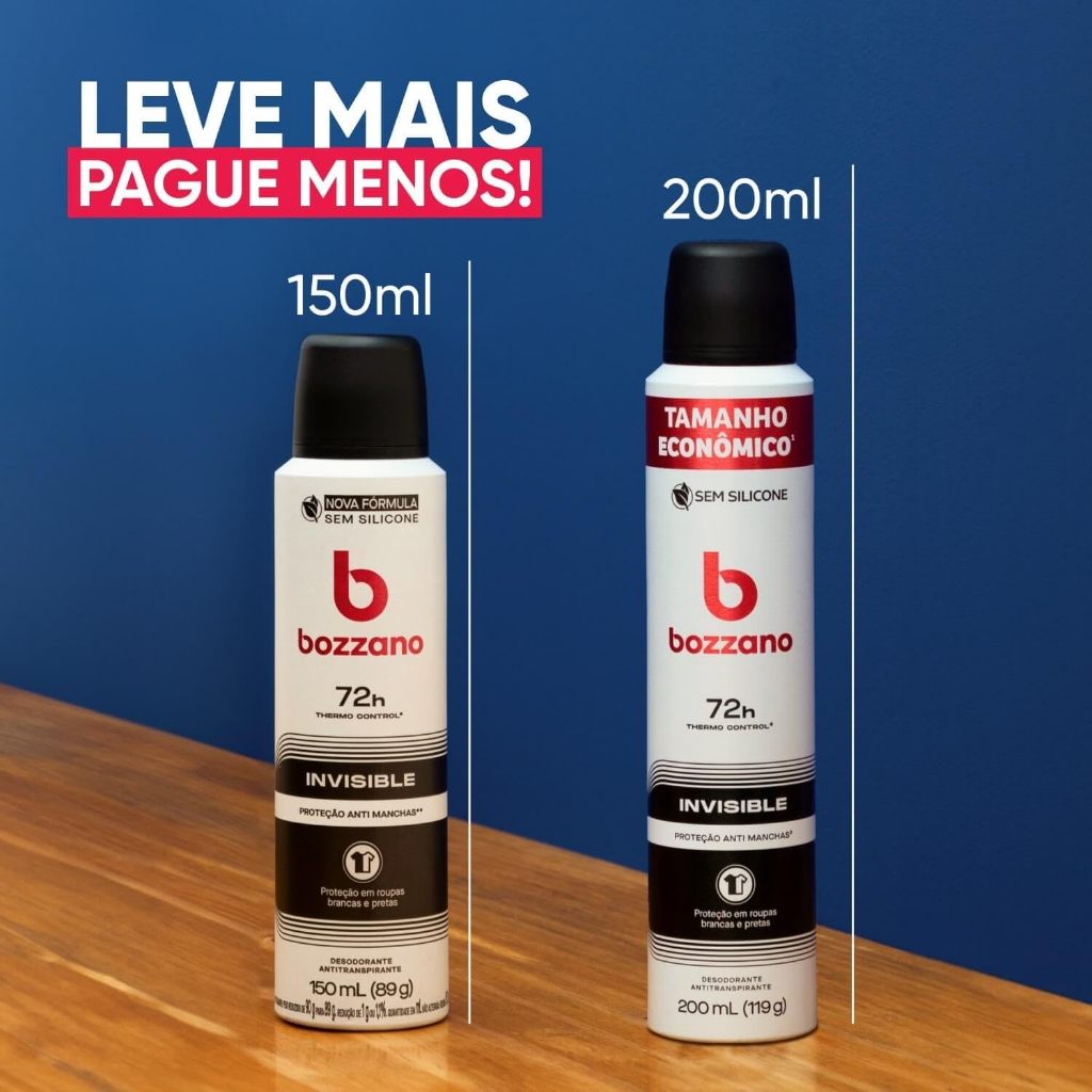 Desodorante Antitranspirante Bozzano Aerossol Invisible 200ml Principais Características: • Fórmula antitranspirante de alta eficácia que controla a transpiração intensa. • Tecnologia Invisible, evitando manchas brancas em roupas claras e amarelamento em roupas escuras. • Aplicação em aerossol, proporcionando secagem rápida e sensação de leveza. Benefícios: • Mantém a pele seca e protegida por horas, mesmo durante atividades físicas ou em dias quentes. • Combate bactérias causadoras de mau odor, mantendo as axilas frescas. • Sensação refrescante imediata e longa duração. • Proteção confiável para o dia a dia e ocasiões especiais. Diferenciais do Produto: • Combinação de proteção antitranspirante e tecnologia anti-manchas. • Fragrância suave e neutra, ideal para todos os tipos de roupas. • Produto da marca Bozzano, referência em cuidado masculino de qualidade. Especificações Técnicas: • Peso: 200 ml Instruções de Uso: • Agite bem antes de aplicar. • Aplique sobre a pele limpa e seca, mantendo o aerossol a cerca de 15 cm da axila. • Evite inalar o produto durante a aplicação. Avisos e Precauções: • Uso externo. • Não aplicar em pele irritada, lesionada ou sensível. • Inflamável. Mantenha afastado de fogo, faíscas e superfícies quentes. • Evite contato com olhos e mucosas. • Mantenha fora do alcance de crianças. O que está incluso? • 1 unidade de Desodorante Antitranspirante Bozzano Aerossol Invisible 200ml ---- DÚVIDAS FREQUENTES ---- Os produtos são originais? Sim. Todos os nossos produtos são originais. Emitem nota fiscal? Sim. Emitimos nota fiscal para todos os pedidos.
