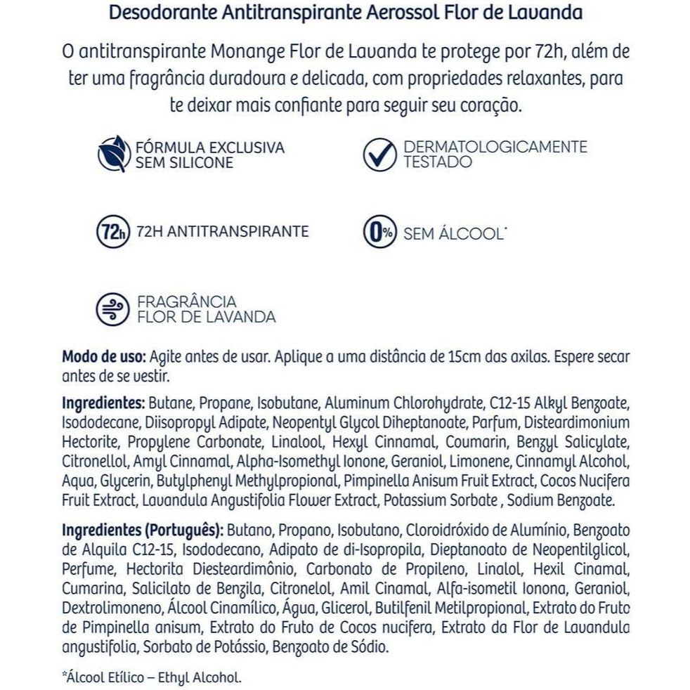 Desodorante Antitranspirante Monange Aerossol Flor De Lavanda Com 150ml