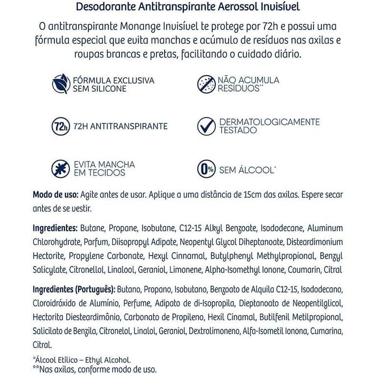 Desodorante Antitranspirante Monange Aerossol Invisível Com 150ml