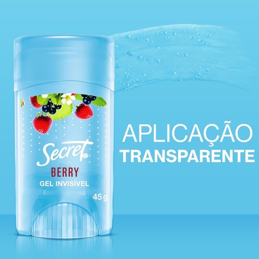 O desodorante antitranspirante Secret em Gel Berry tem uma fragrância suave de frutas vermelhas. Com a aplicação transparente, te oferece uma proteção superior+ contra o suor e o mau odor. É anti-manchas*, não deixa manchas brancas na aplicação. Seca rápido e tem um cheiro fantástico. Protegida, seca e perfumada o dia inteiro com Secret.Fácil de usar, aplique diretamente na pele. Retire o selo de segurança, use 2-3 clicks por axila, aplique diariamente somente nas axilas e mantenha a embalagem bem fechada.+vs. P&G Spray.*Manchas brancas nas roupas na aplicação • SUAVE AROMA DE FRUTAS VERMELHAS. Protegida, seca e perfumada todo o dia com a proteção contra o suor e mau odor que o desodorante antitranspirante Secret em gel te oferece • APLICAÇÃO TRANSPARENTE. Te protege instantâneamente antes que você comece a suar e o melhor: É anti-manchas*! *Manchas brancas nas roupas na aplicação • LIVRE DE CRUELDADE ANIMAL: Secret é uma marca livre de crueldade certificada pelo PETA • MODO DE USO. Se aplica diretamente na pele, sem disperdícios no ar. Retire o selo de segurança, use 2-3 clicks por axila, aplique diariamente, somente nas axilas e deixe a embalagem bem fechada • SOBRE SECRET. Desde 1956, Secret vem ajudando mulher a brilhar trazendo o melhor de si mesma, proporcionando uma incrível proteção contra o mau odor e refrescância o dia todo