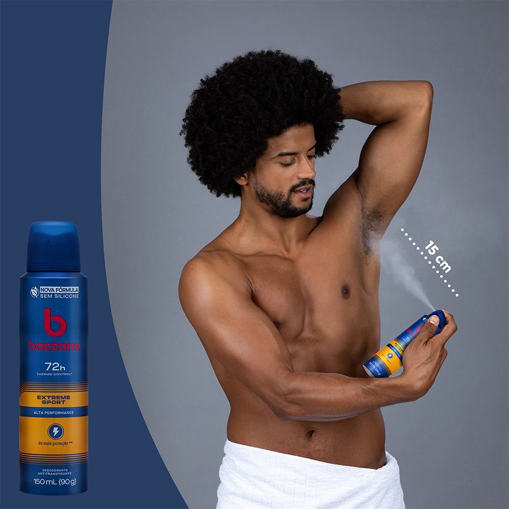 Desodorante Bozzano Extreme Sport Aerossol Antitranspirante Masculino 150ml Desenvolvido para garantir proteção máxima em momentos extremos, a fórmula sem álcool do desodorante aerossol Bozzano Extrem