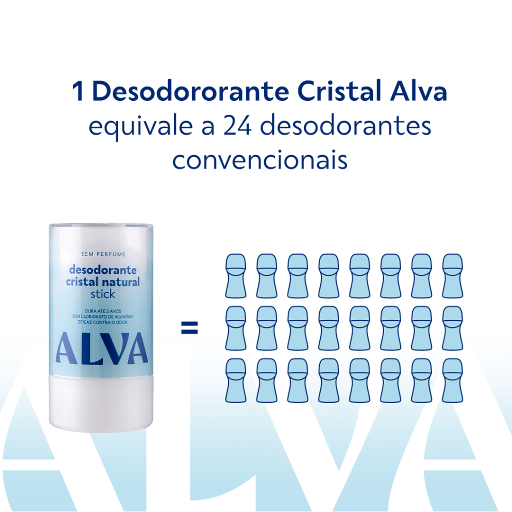 O Desodorante Natural Mais Vendido no Brasil! Com apenas um ingrediente natural, o Cristal Alva elimina as bactérias responsáveis pelo odor. Nada de manchas na roupa, e uma proteção natural e saudável por 12 horas! 👕 Sem manchas nas roupas 🕒 Proteção natural por até 12 horas 📅 Dura até 2 anos 🌍 Em 2 anos, menos 24 embalagens no meio ambiente