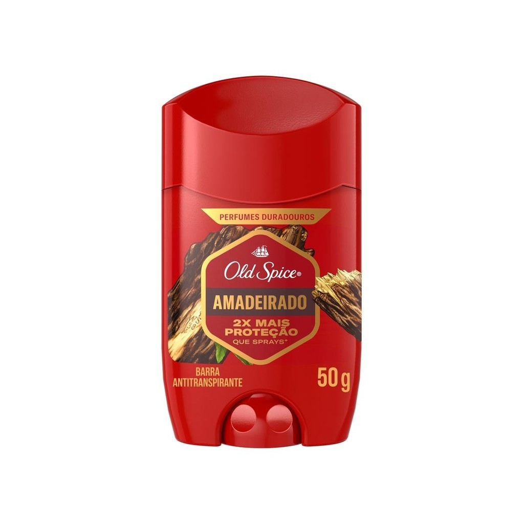 Descubra o desodorante antitranspirante em barra Old Spice Amadeirado! Sinta-se mais confiante e protegido contra o suor e o mau cheiro, com sua incrível fragrância amadeirada com menta e especiarias. • 2x mais proteção que sprays**Vs. Old Spice Spray • Perfume duradouro • Fragrância amadeirada com menta e especiarias • Você longe do cheiro de cecê ou suor • Dura até 40 días****Com base na instruçao de uso para 1.2g por día