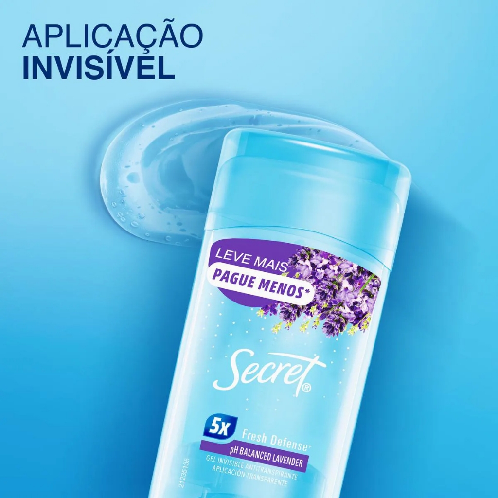 Desodorante Antitranspirante Gel Secret pH Balanced Lavender 73g O Secret Gel Invisível é a escolha ideal para quem busca proteção eficaz contra o suor e o mau odor, sem abrir mão do cuidado com a pele e com as roupas. Sua fórmula avançada com tecnologia neutralizadora de odores detecta e bloqueia o mau cheiro, ajudando a prevenir o acúmulo de bactérias causadoras do odor, garantindo até 48 horas de frescor e segurança. Com textura em gel transparente, o produto seca rapidamente, não mancha a pele nem as roupas e oferece uma aplicação suave e confortável. Sua fragrância suave de algodão proporciona uma sensação de limpeza prolongada ao longo do dia. Benefícios - 48h de proteção contra suor e odores intensos - Tecnologia antiodor: detecta e bloqueia o mau cheiro antes que ele apareça - Textura em gel invisível: não deixa manchas brancas ou resíduos - Fragrância suave e agradável de lavanda - Secagem rápida e toque seco - Ideal para roupas escuras ou coloridas - Fácil de carregar: embalagem prática para o dia a dia Modo de uso Remova o lacre de segurança. Gire a base até que o gel apareça na superfície. Aplique diretamente nas axilas limpas e secas. Após o uso, feche bem a embalagem.