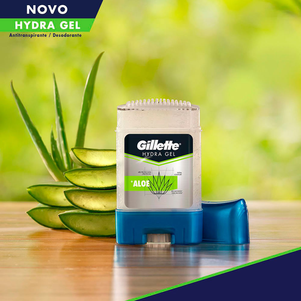 DESODORANTE GEL ANTITRANSPIRANTE GILLETTE HYDRA GEL ALOE 82G A Gillette apresenta seu novo antitranspirante em Géis, Hydra Gel. Sua fórmula não contém álcool etílico, o que ajuda a proteger a pele co
