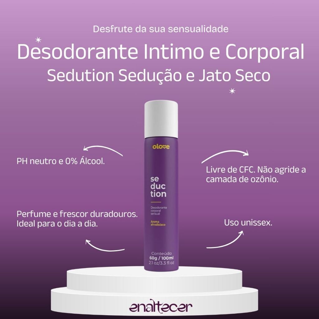 Desfrute da sua sensualidade01 - Desodorante Íntimo Seduction - 60g/100mlDesodorante íntimo corporal aerossol Seduction foi especialmente desenvolvido para mulheres que se preocupam com a completa higiene do corpo, particularmente com sua região íntima. Sua fórmula suave proporciona diariamente uma agradável sensação de frescor e bem estar durante todo o dia. Segurança, conforto e perfume único que vai deixar seus momentos íntimos muito mais agradáveis. Livre de álcool com PH neutro é ideal para uso diário. Não contém CFC , inofensivo para a camada de ozônio. Jato seco oferece maior conforto durante a aplicação. Especificação do ProdutoCuidado diário, frescor e bem estar.Uso unissex.Prática embalagem aerossol proporcionando muito mais conforto durante a aplicação.Perfume e frescor duradouros.Ideal para o dia a dia.Embalagem desenvolvida para transporte em bolsa ou necessaire.Use após o banho ou para momentos íntimos marcantes.Livre de CFC. Não agride a camada de ozônio.PH neutro e 0% Álcool.Jato seco.Modo de usar: Agite bem antes da aplicação.Aplicar a uma distância de 15 cm da pele.Aplique após o banho e sinta o perfume.Uso externo. IngredientesCyclomethicone; Parfum; ButhylPhenyl Methyl Propional; Hexyl Cinnamal; Butane; isoButane; Propane.Embalagem discreta.Enalteça onde for.Equipe, Enaltecer.